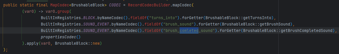The codec for BrushableBlock misspells the word 'completed' as 'comleted' in the field `brush_comleted_sound`. The field should be named `brush_completed_sound`.