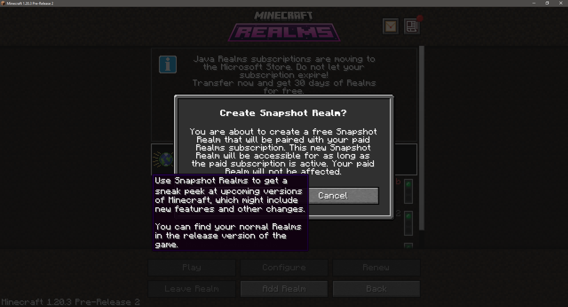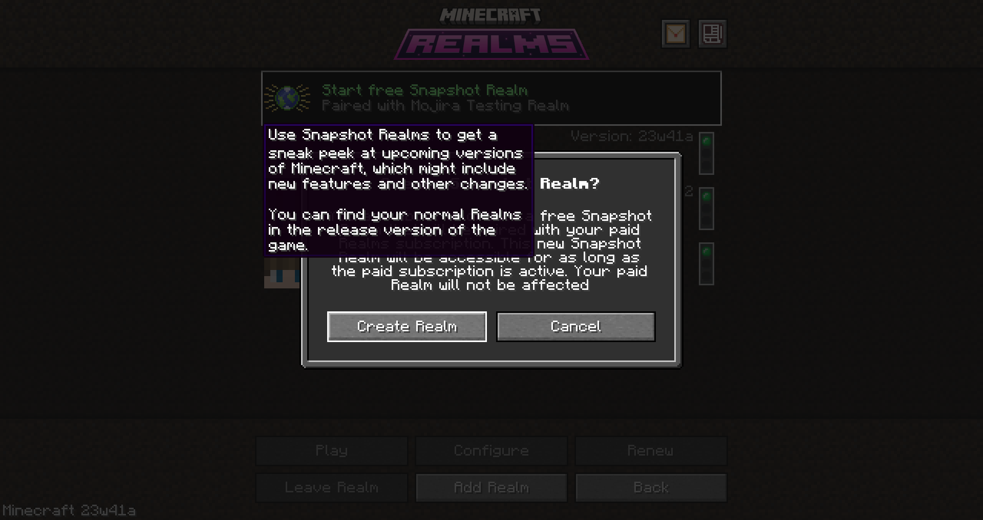 Take note as to whether or not the "Start free Snapshot Realm" element can be selected or remain selected causing its tooltip to erroneously be visible when other interfaces are open.