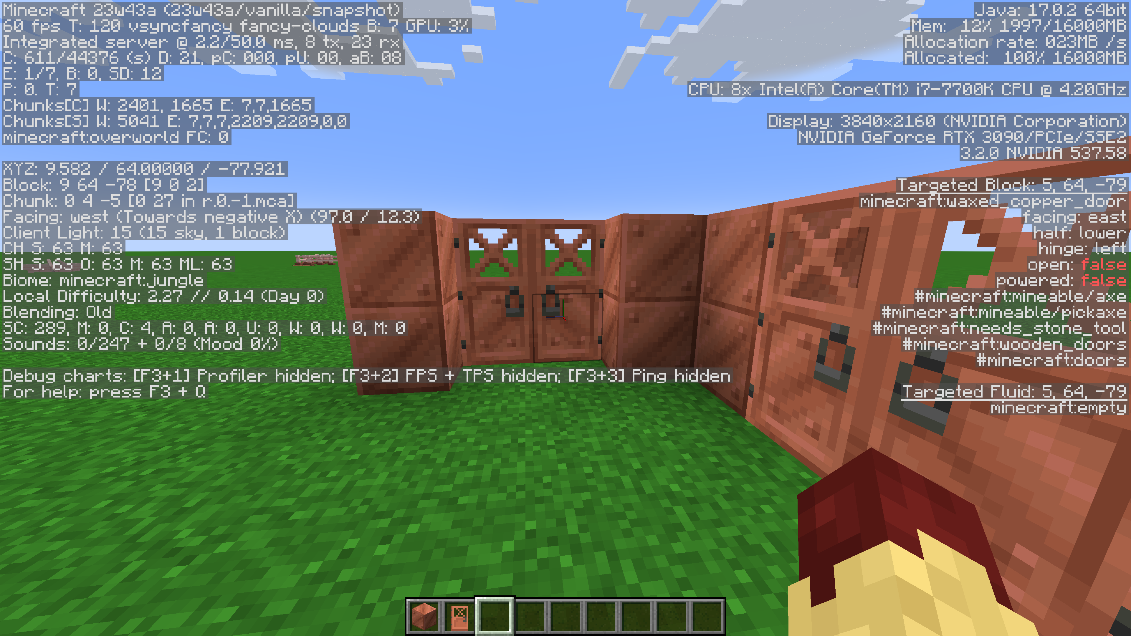 Front texture of the Copper Doors with hinge: right blockstate and back texture of Copper Doors with hinge: left blockstate have inconsistent shading in their textures when compared to surrounding copper blocks. Issue is present with all Copper Door oxidation levels, pictured in attachments is only un-oxidized variant because the issue is most prevalent.