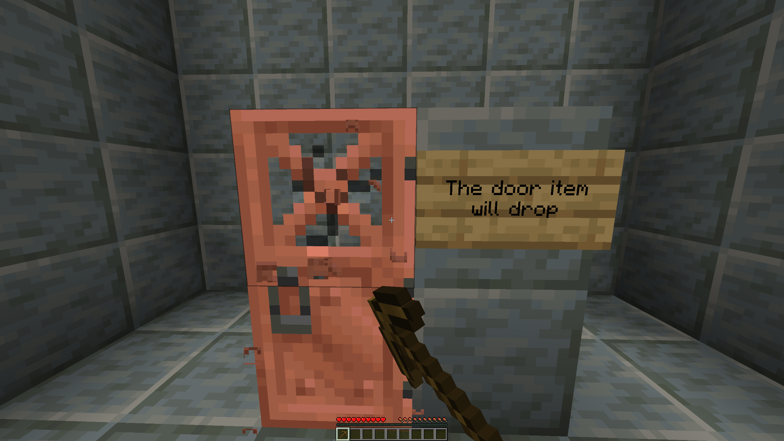 Place a copper door of any oxidation level, waxed or unwaxed. In survival mode, when broken using a pickaxe of stone material or better, or an axe of stone material or better (which may also be a bug caused by MC-266113) the door item will drop regardless of whether the top half or bottom half is broken. This works as intended. However, when a wooden tool, a tool that is not a pickaxe or axe, or a non-tool item is used to break the door, the door item will only drop when the top half is broken.
