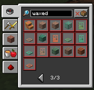 (also, probably not related, but wouldn't it make more sense to have the "waxed [x weathering] [copper block]" recipes stack? like, all the waxed cut coppers of different weatherings. like how wood recipes stack for all of the different kinds of wood. i think that would be better organized but shrug)