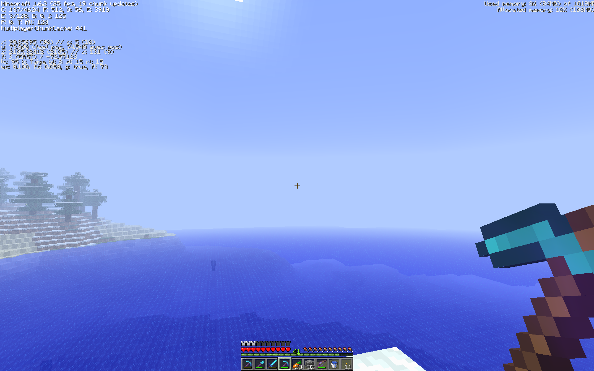 When using a regular item such as a carrot, my FPS is normal. When equipping an item such as a pickaxe or sword, my FPS drops dramatically. When using a bow this effect is increased. This is better displayed in the below images in a survival world.