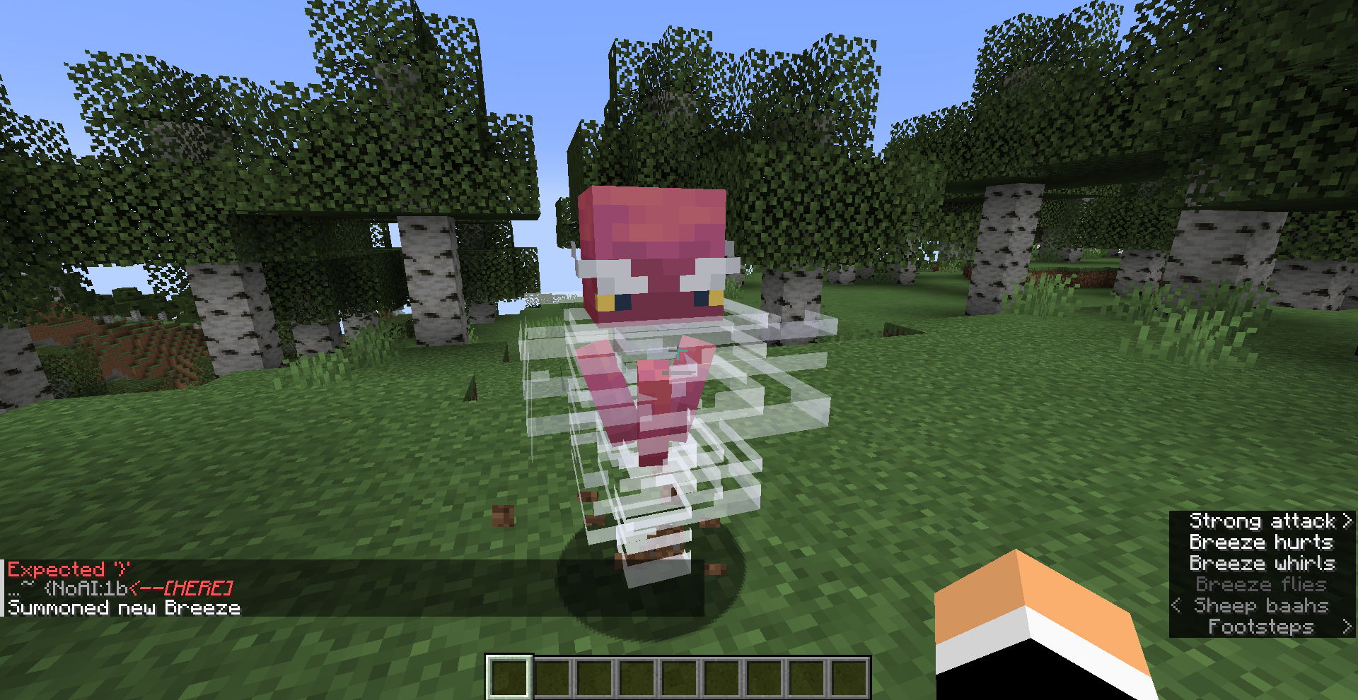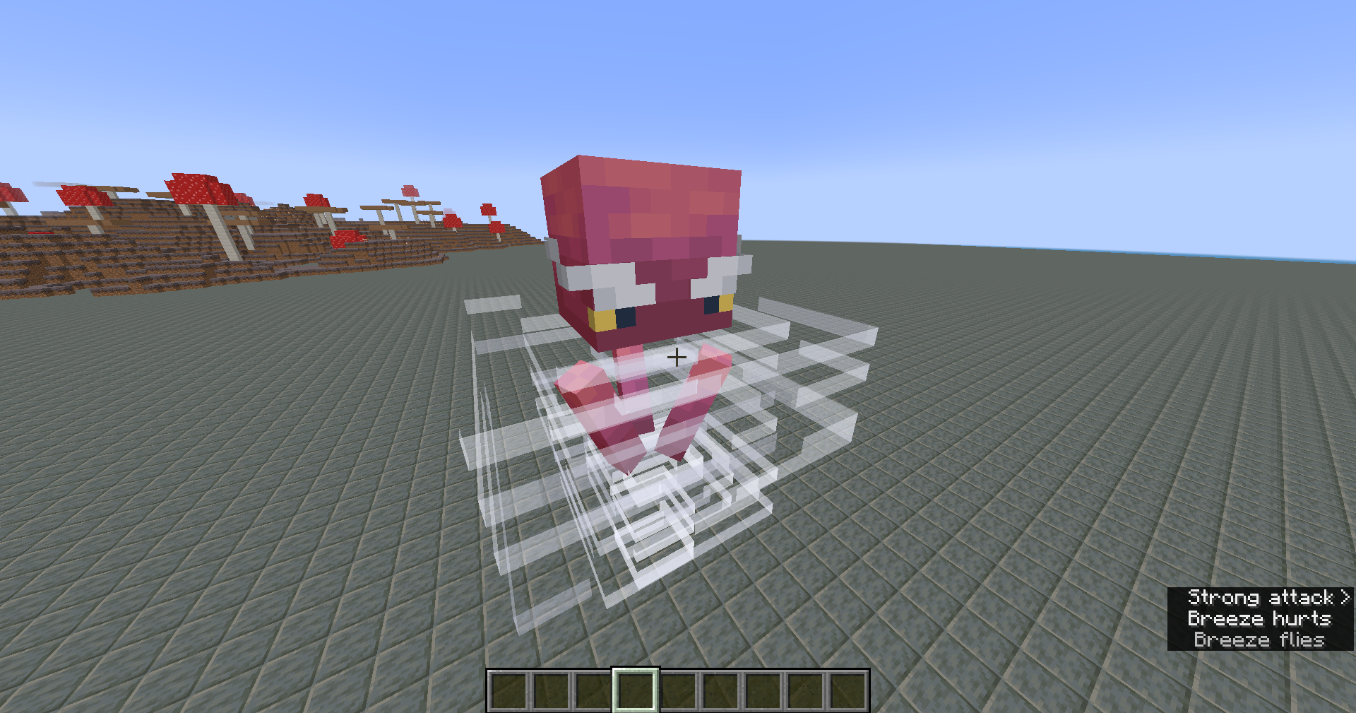 /summon minecraft:breeze ~ ~ ~ {NoAI:1b}Attack the breeze and watch its eyes and eyebrows closely.