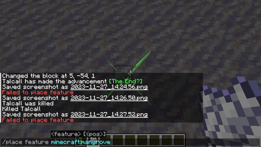 Alternatively, using /place feature minecraft:mangrove will provide feedback in the chat window (fig. 2)