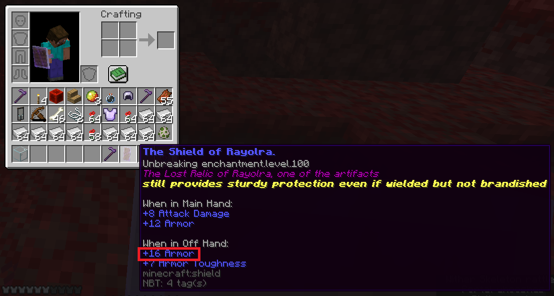 (In the picture, holding a hoe in the main hand and a shield in the offhand should increase the generic.armor to 26.)