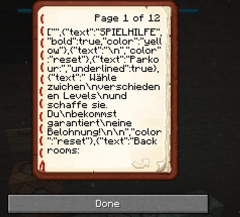 The command for the book is this one, if you want to reproduce: /give @p written_book{pages:['["",{"text":"SPIELHILFE","bold":true,"color":"yellow"},{"text":"\\n","color":"reset"},{"text":"Parkour:","underlined":true},{"text":" Wähle zwichen