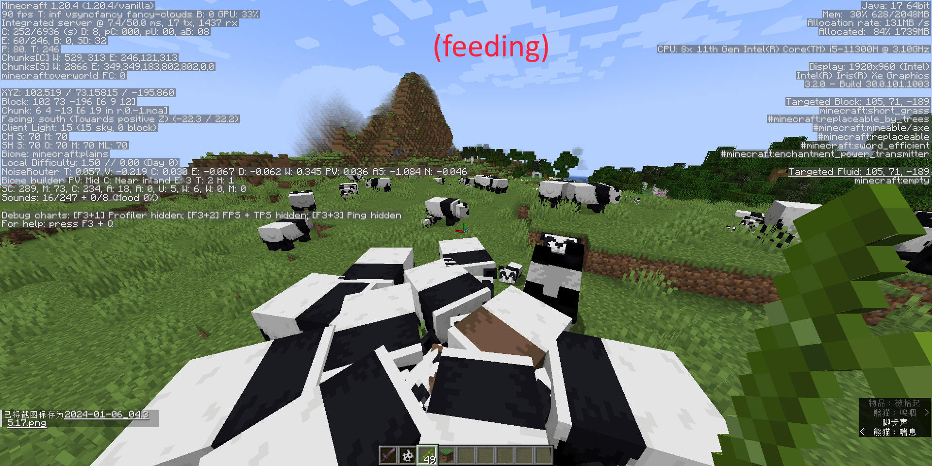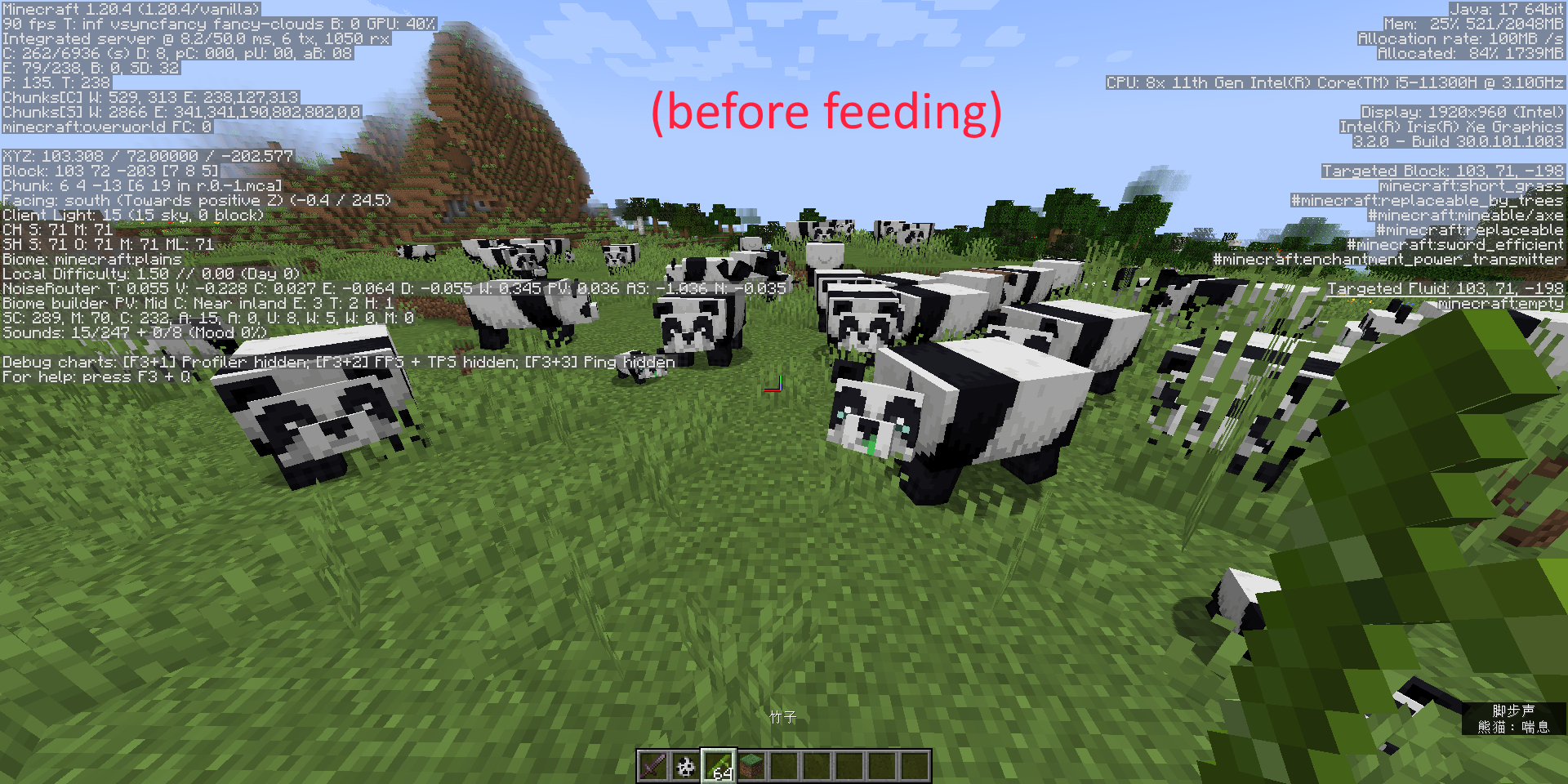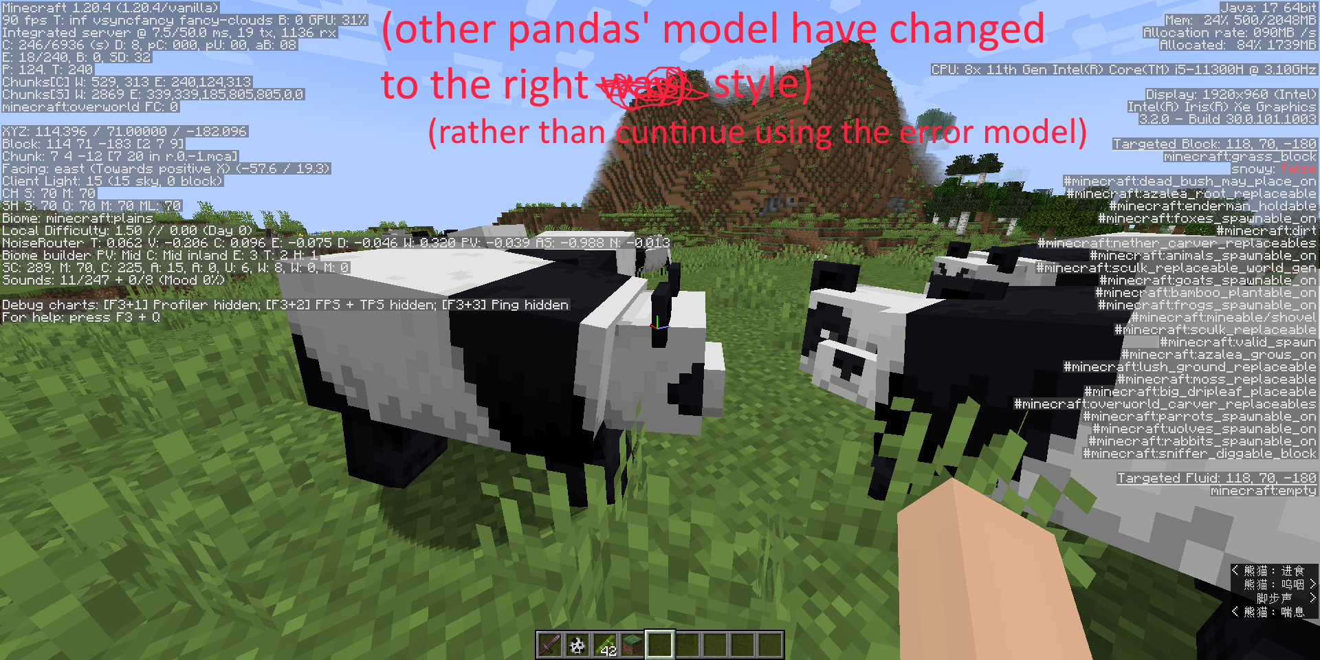原话 " 在Minecraft1.20.4中,熊猫的模型有错误,致使他们的脊背看起来是水平的。但是,当至少喂食一次之后,他们的模型会全部地自动修正,看起来是倾斜的。而且只要未重启游戏,熊猫的模型都不会再变回原先错误的模样,无论你是换存档玩还是换服务器玩。 (或许也可能是我正好理解反了,这也许是个喂食后模型集体出错的bug)"