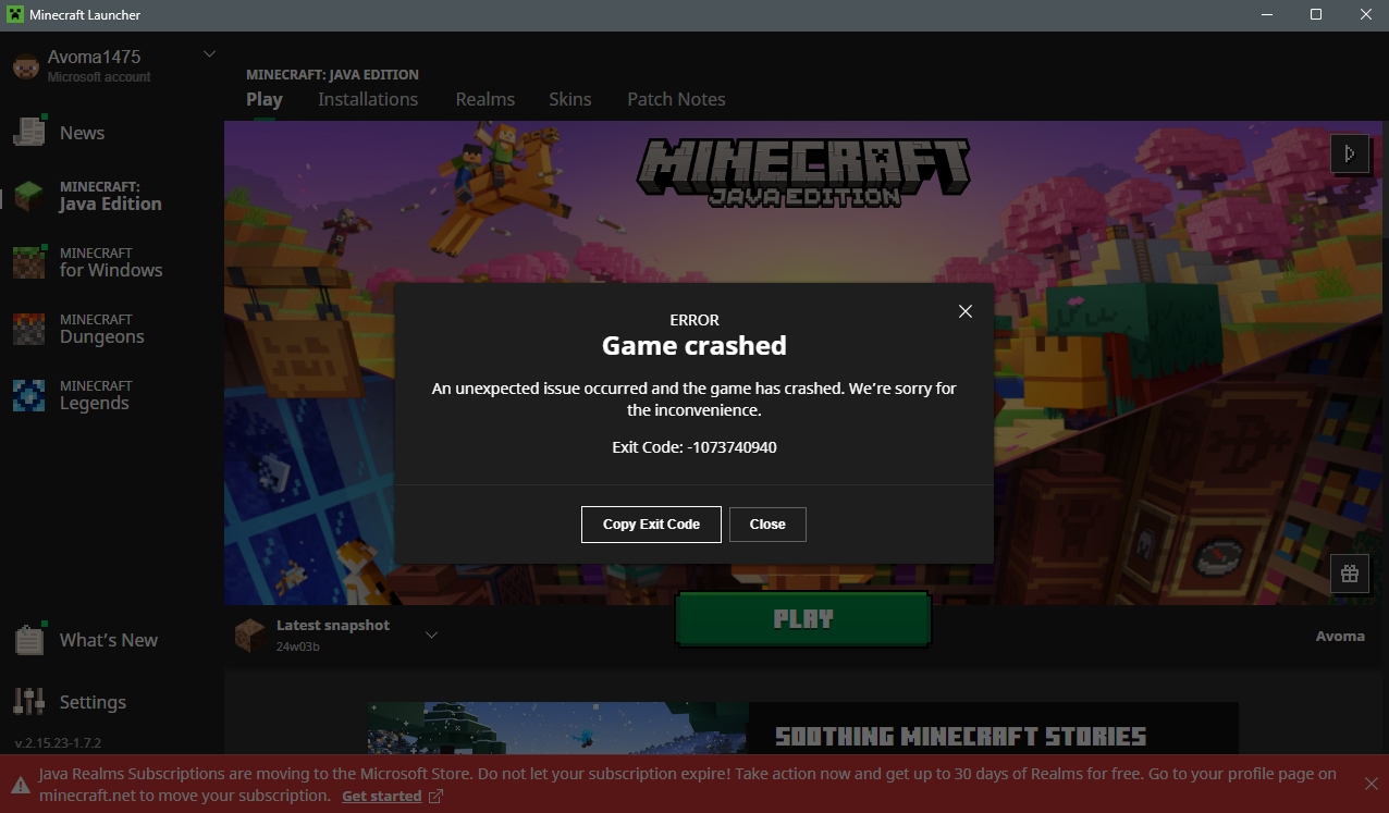 Click the "Create New World" button and watch how the game freezes.