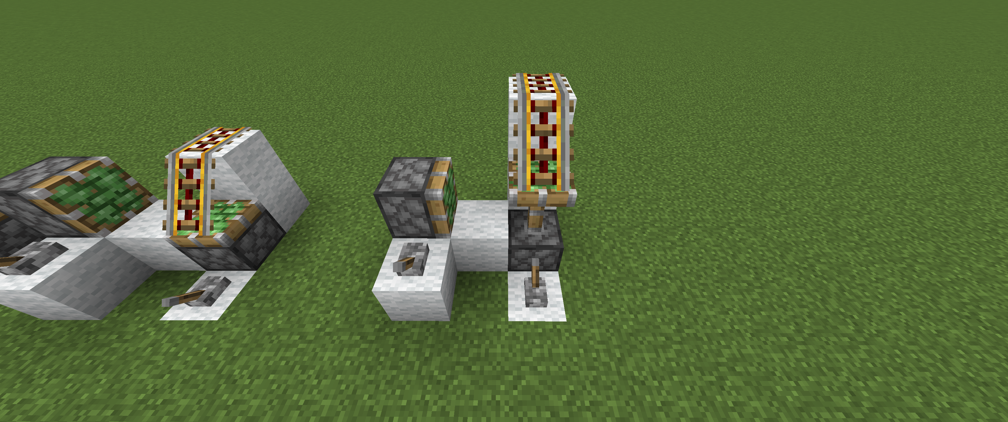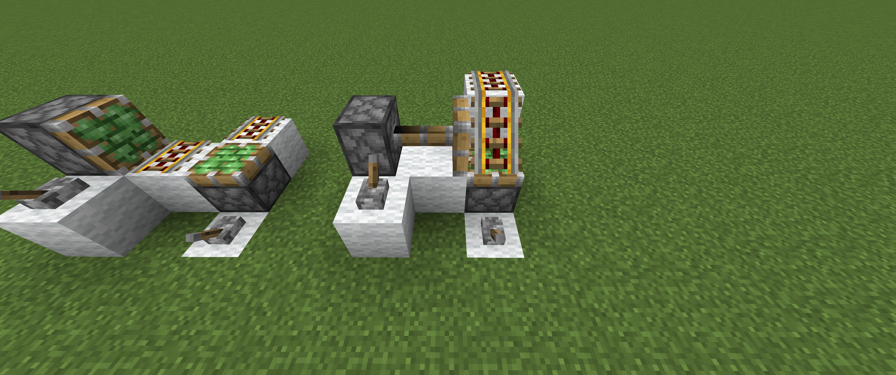 Slanted rails cannot be pulled horizontally by sticky pistons and instead break and drop as an item, see Figures A and B. This issue does not affect rails that are 'flat,' as shown in Figures C and D, or sloped rails that are pulled down, as shown in Figures E and F.