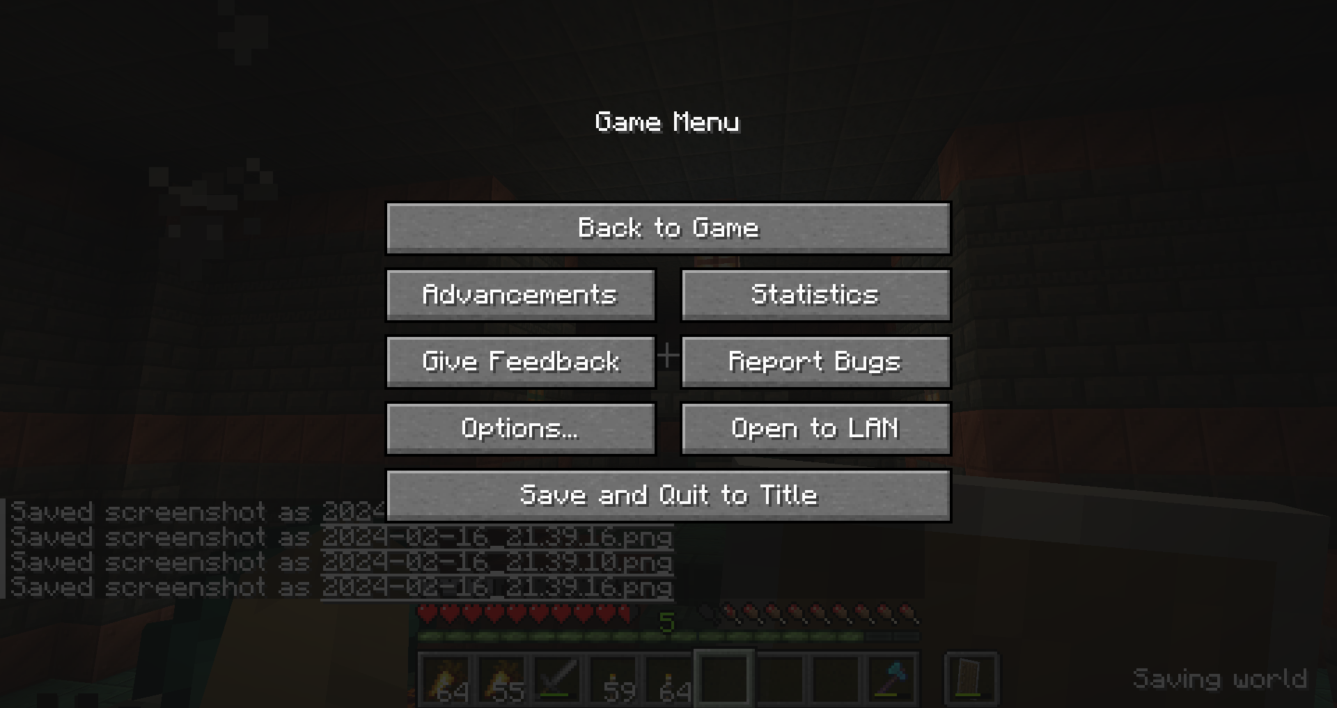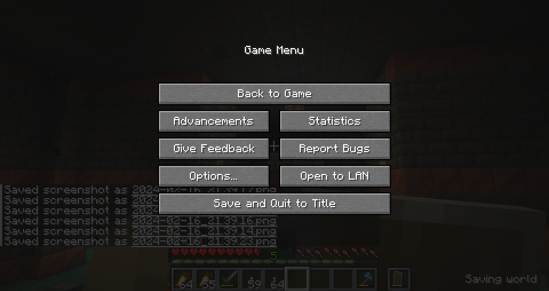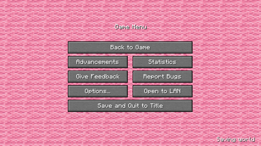 The "Saving world" text (introduced as a fix to MC-73300) is rendered behind the dark background of the pause menu, instead of on top as it used to be.