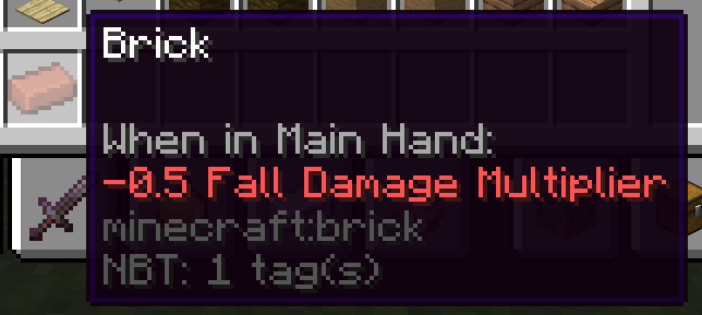 /give @s brick[minecraft:attribute_modifiers={modifiers:[{type:"minecraft:generic.fall_damage_multiplier",name:"a",operation:"add_value",amount:-0.5,uuid:[I;1,1,1,1],slot:"mainhand"}]}]Notice that the attribute description is red despite it having the positive effect of reducing fall damage.