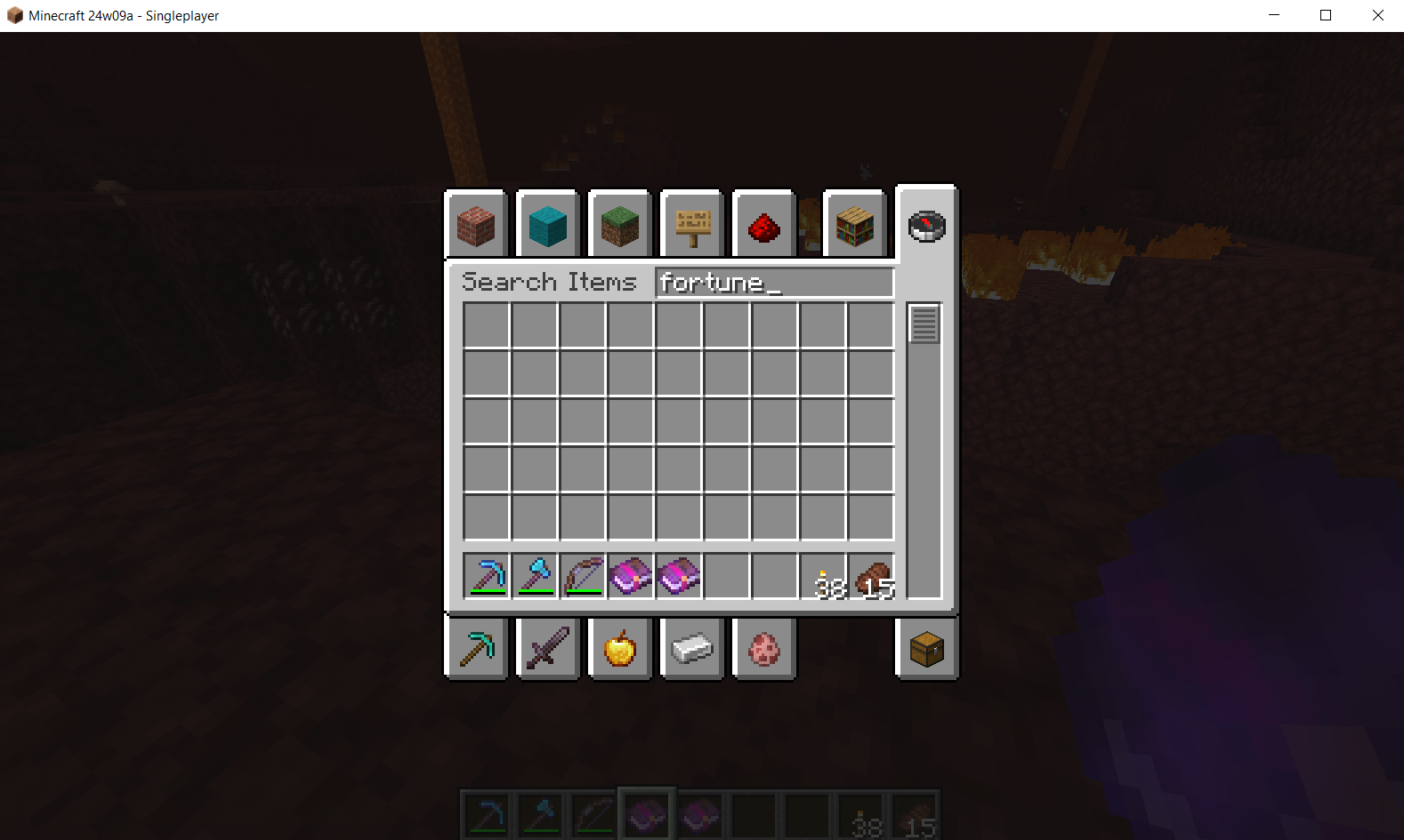 The Fortune III does not appear in the Ingredients Creative Menu tab, and none of the tiers (Fortune I, Fortune II or Fortune III) appear when looking through all enchanted books with the Search tab function. It also does not appear when searching for "Fortune" specifically, but other enchantments appear as normal.