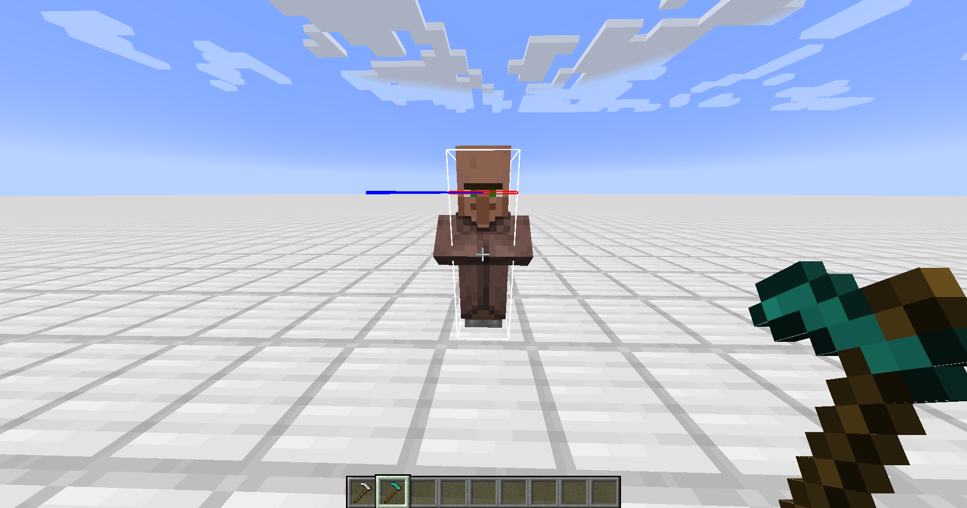 /summon minecraft:villager ~ ~ ~ {NoAI:1b}/give @s minecraft:iron_hoe/give @s minecraft:diamond_hoeEquip the Iron Hoe and look at the villager.