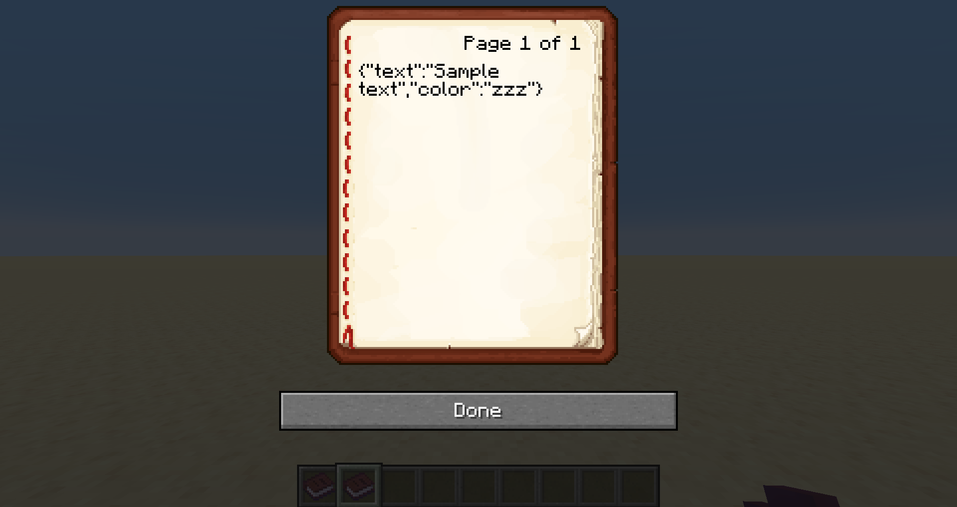 /give @s written_book{pages:['{"text":"Sample text","color":"zzz"}'],title:MC-269335,author:j_p_smith} 2Place the books in separate slots