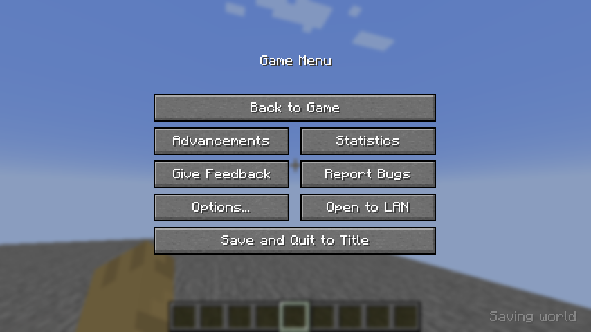 The visual indicator used to state the world is currently being saved is different across editions: Java Edition uses the text "Saving world", whereas Bedrock Edition uses an animation with a chest.
