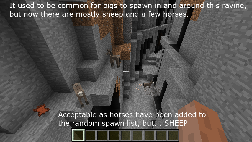 I noticed plains biomes are spawning disproportionately large numbers of sheep groups. The amount of cows and horses seems to be "normal" as well as chickens, maybe, but pigs have become a rarity.
