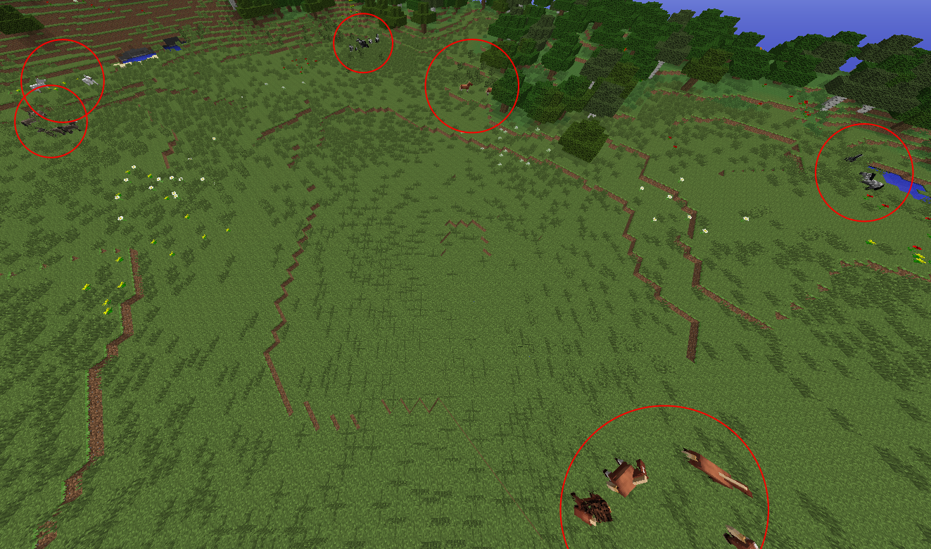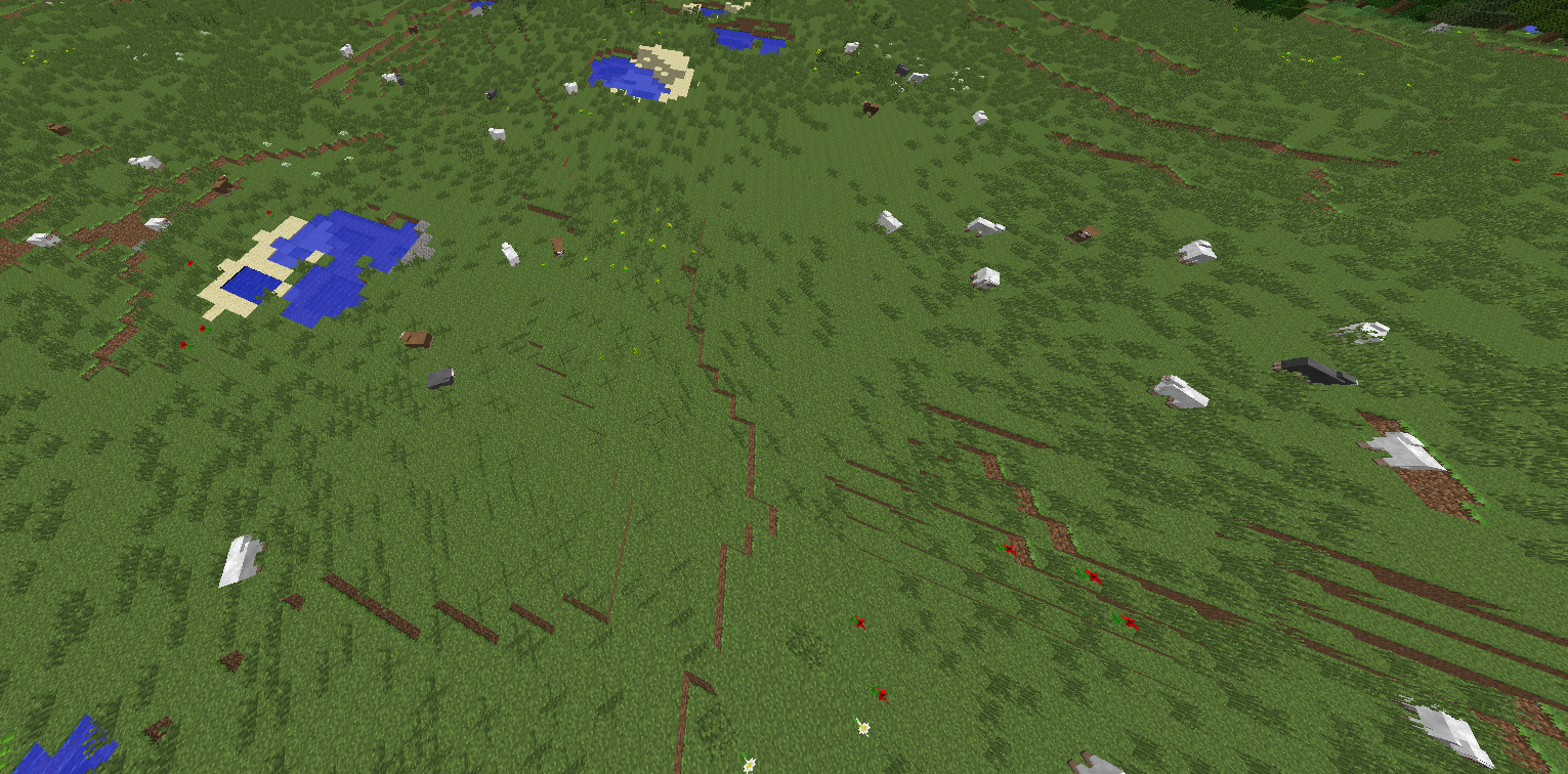 6. From the world spawn point, head south until you reach a large lake, then head east into the nearby plains biome. Here is where I found spawn after spawn of sheep. Even flying all over the plains biome nearly all the spawns were sheep.