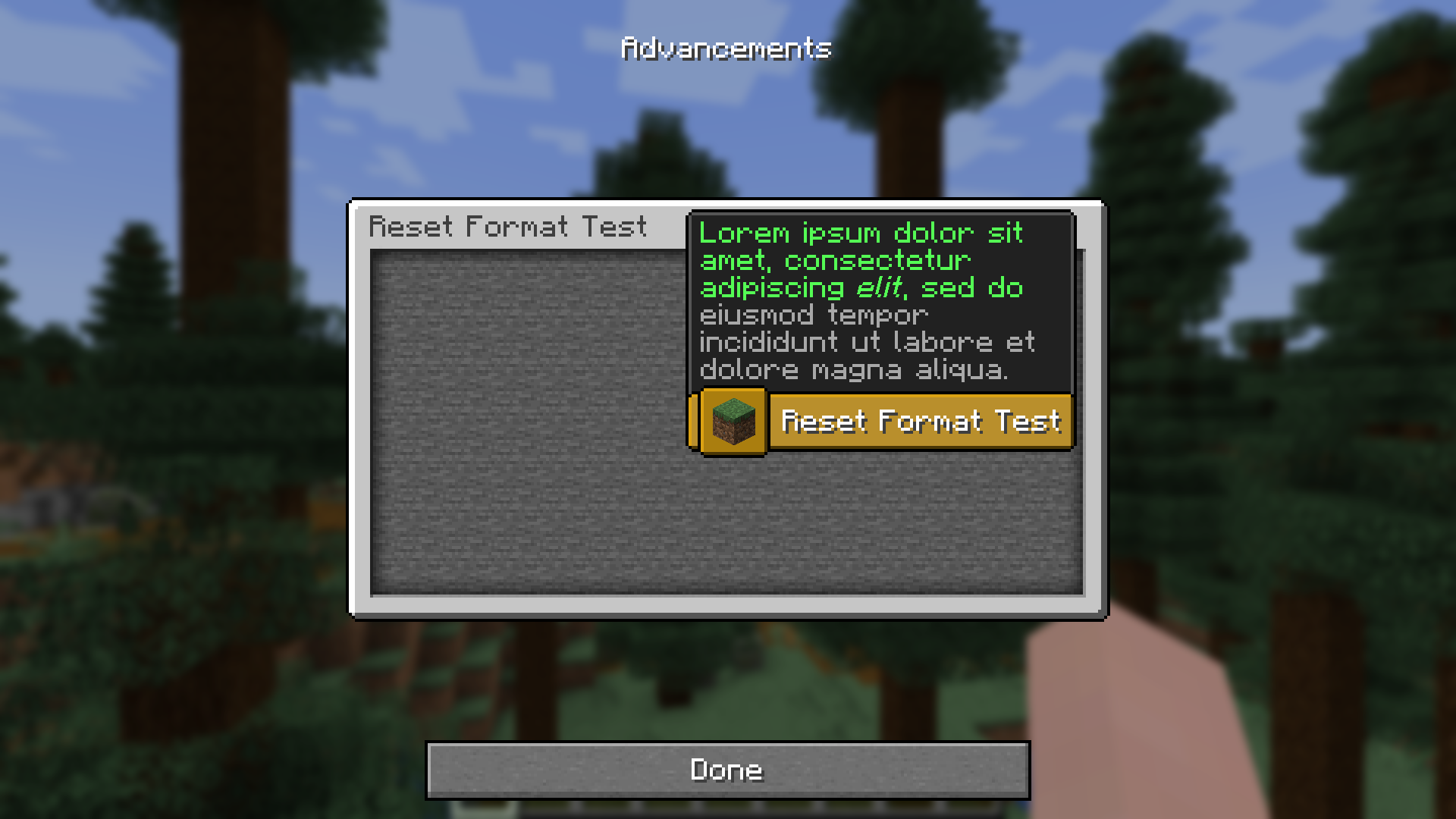 Download the attached data pack “reset_format_test.zip” and add it to a new or existing world. This data pack adds a single advancement that is granted immediately and has the following string as its description text: