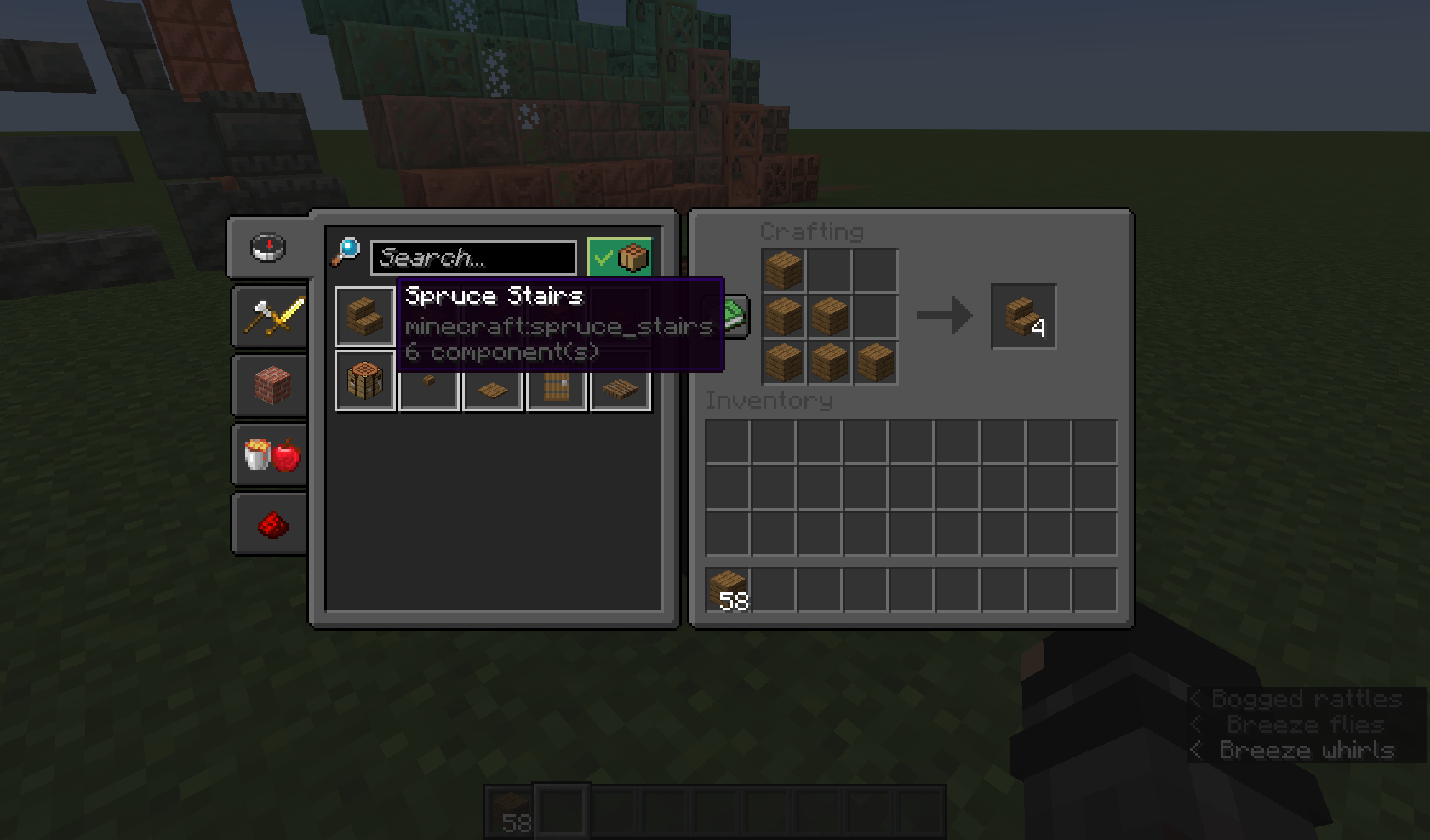 When clicking on Certain Recipes in the Recipe Book, you cannot stack items in the Crafting Grid. Recipes such as Spruce Stairs, Chests, and Bowls, will not stack any more then one set of blocks in the crafting Grid when clicking them in the Recipe Book.