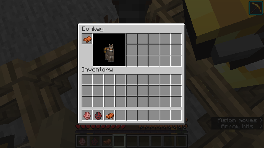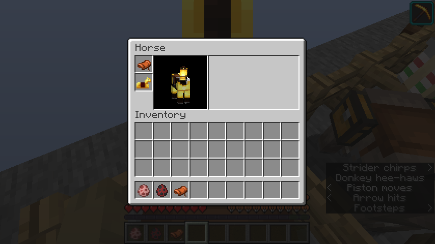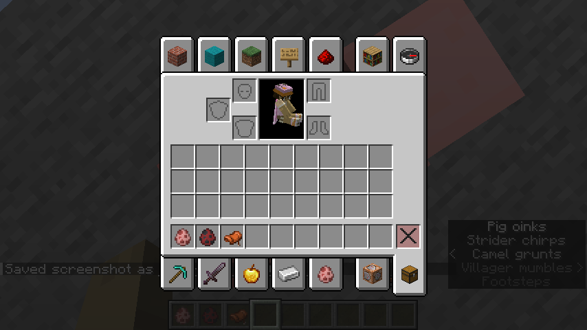 When opening the inventory when riding a horse, donkey, mule, llama or camel, the inventory screen for that mob is opened. However, doing the same on a pig or on a strider opens the player inventory screen rather than the pig's/strider's inventory, which does not seem correct at all.