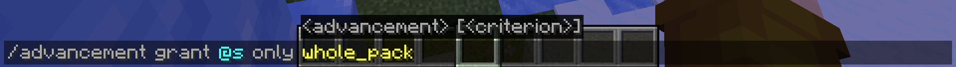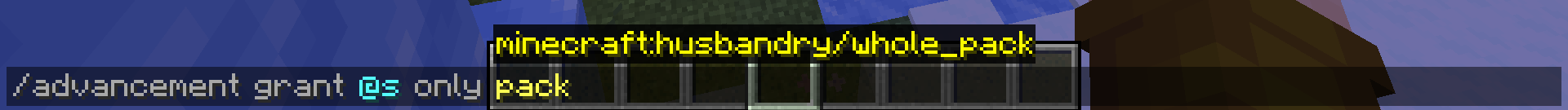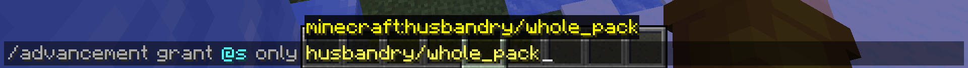 One or several hints should show up, including the wanted advancement, the same way as minecraft:husbandry/whole_pack shows up when inputting “pack” or “husbandry/whole_pack”