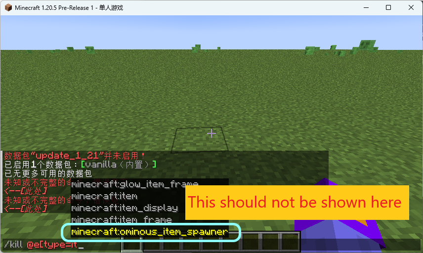 When typing "@e[type=", the command suggestion shows a list of entities that contains disabled entities by disabled vanilla data packs.
