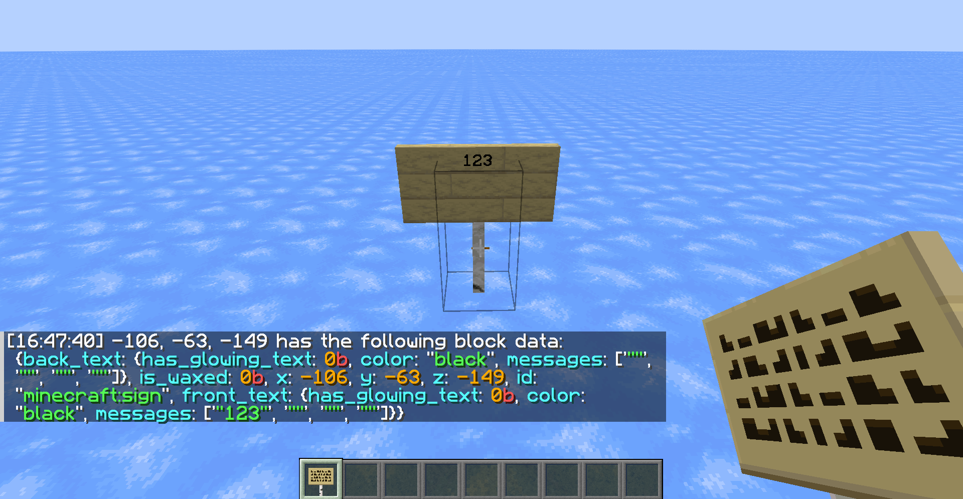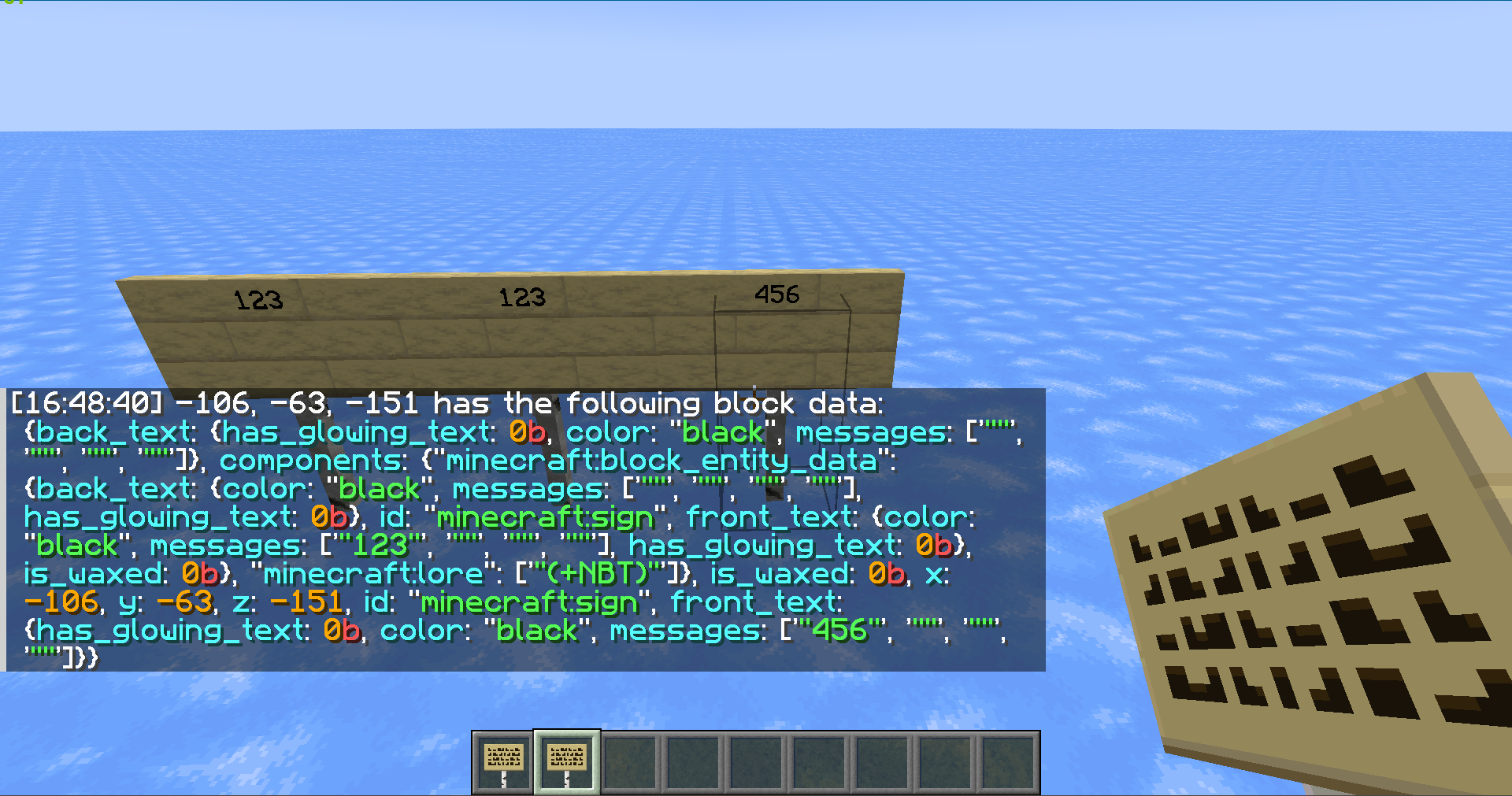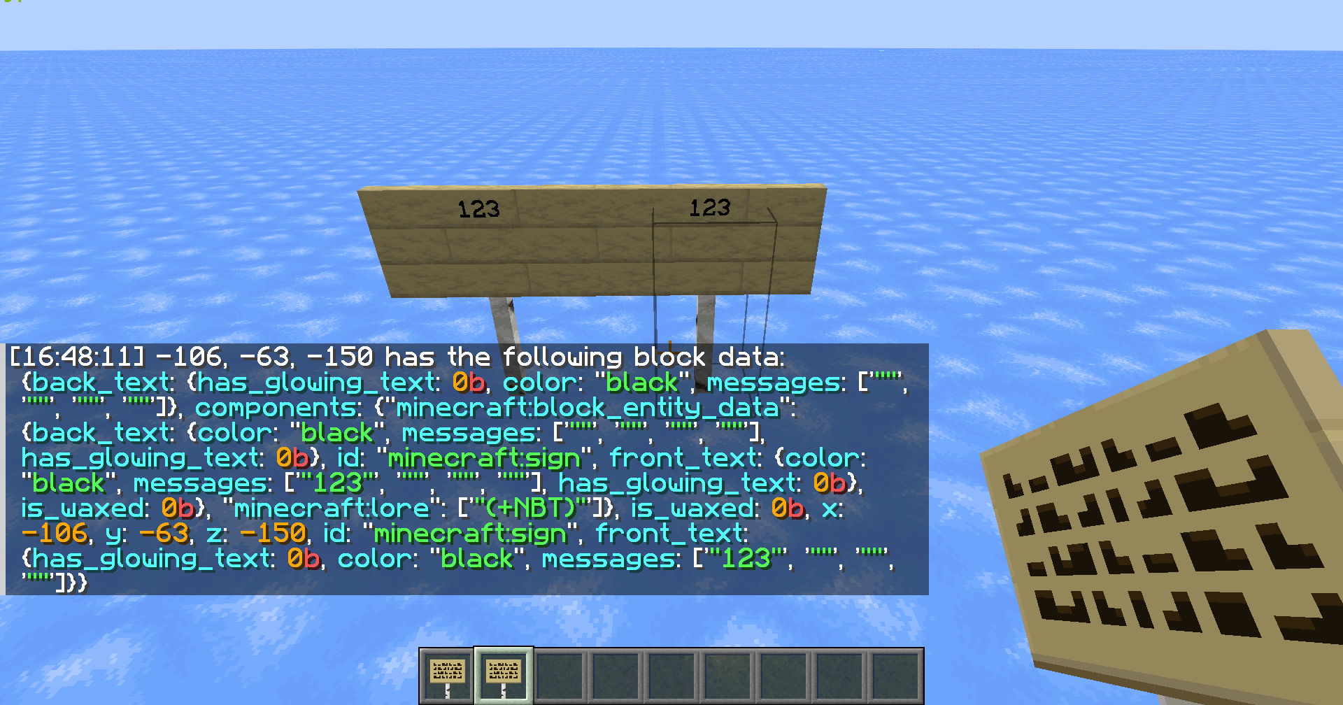 I put the same sign with NBT on it and I rewrote the text.The block data like a tragedy.