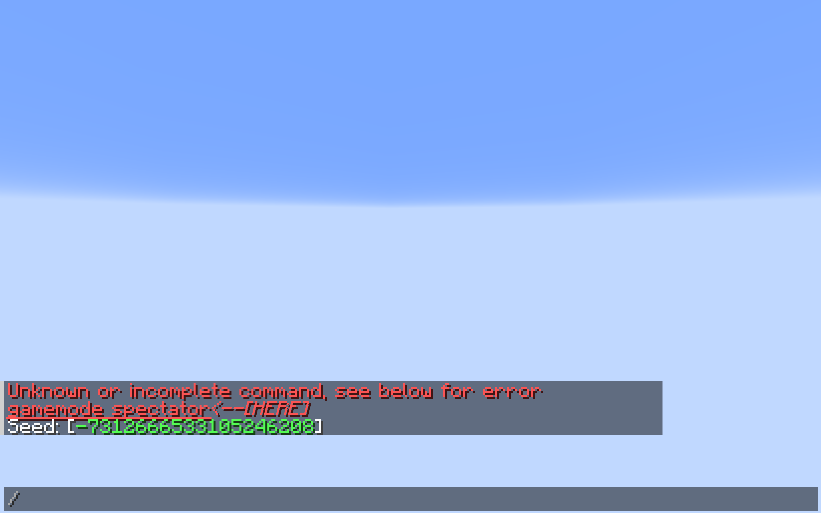 Upon death in a hardcore world, the normal "You died!" screen appeared, with the options to spectate world or save and quit to title. I clicked the spectate world option, but after doing so I was put in a void that only seemed to consist of the sky texture/sun. No blocks or terrain, no entities or mobs, no clouds, nothing. I tried using /gamemode spectator and /tp , but I just got an error message (I know close to nothing about commands). When I checked the F3 menu, I saw that my coordinates were near 0, 0; I decided to fly to those coordinates to see if any spawn chunks were visible, but none were. The same result happened after exiting the world, quitting Minecraft, and reentering. I've created a couple hardcore worlds, and the bug occurs consistently across them.