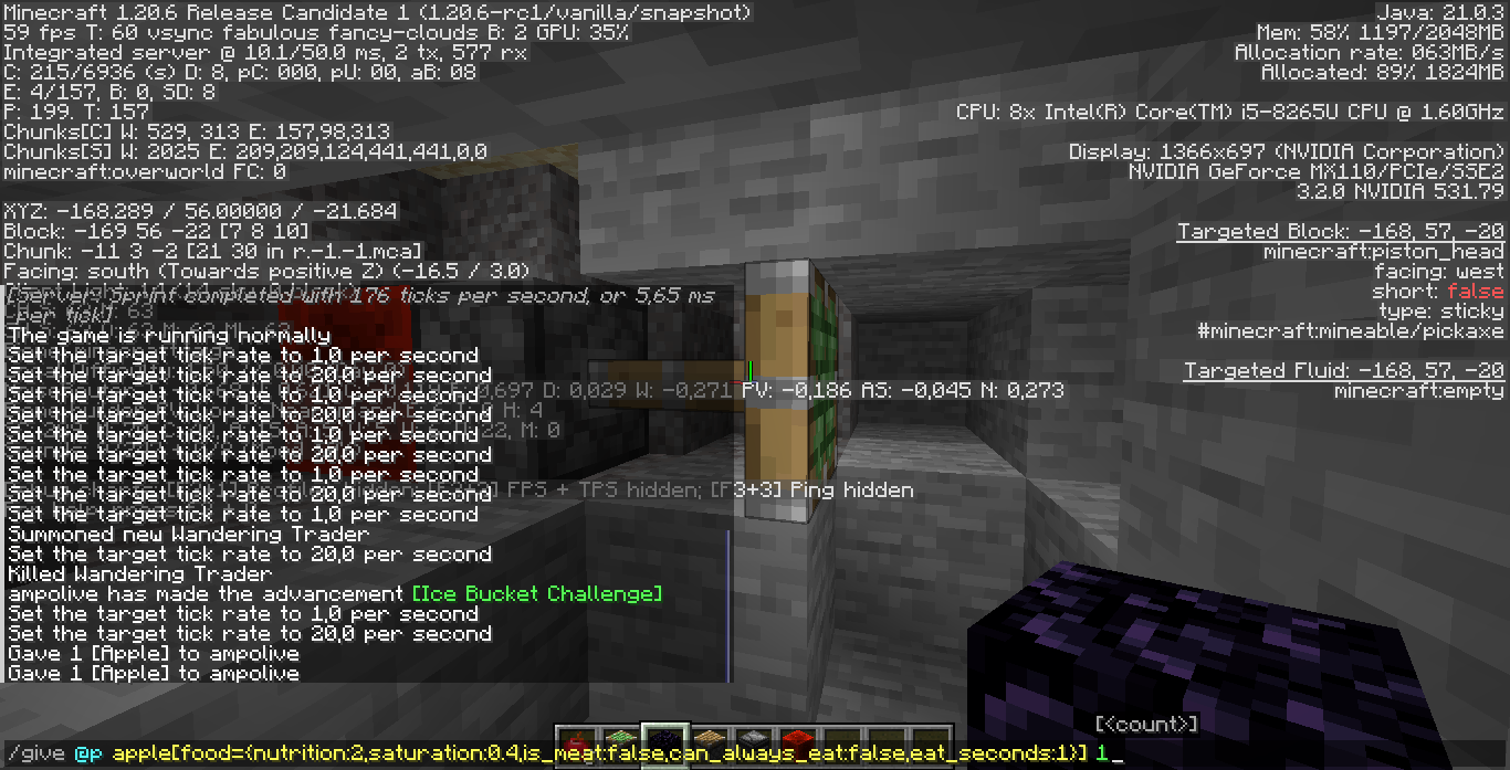 /give @p apple[food={nutrition:2,saturation:0.4,is_meat:false,can_always_eat:false,eat_seconds:1}] 1