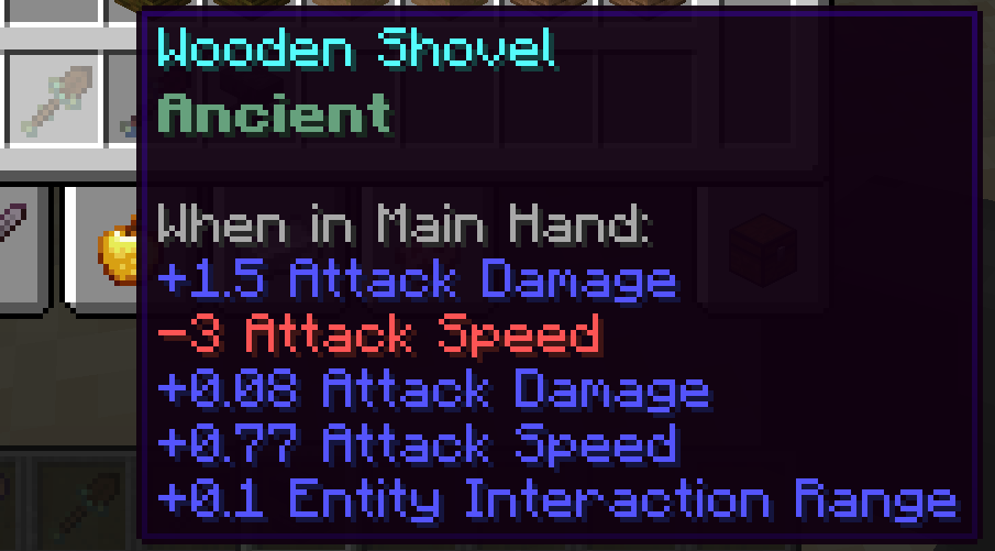 However, when any custom attributes are applied to a tool via commands or datapacks, all of its attributes change format; instead displaying as blue or red, and presenting their attributes in relativity to the player's base stats (i.e; the unenchanted Ancient Wooden Shovel shows "+1.5 Attack Damage", rather than the flat 2.5 displayed on the default Wooden Shovel).