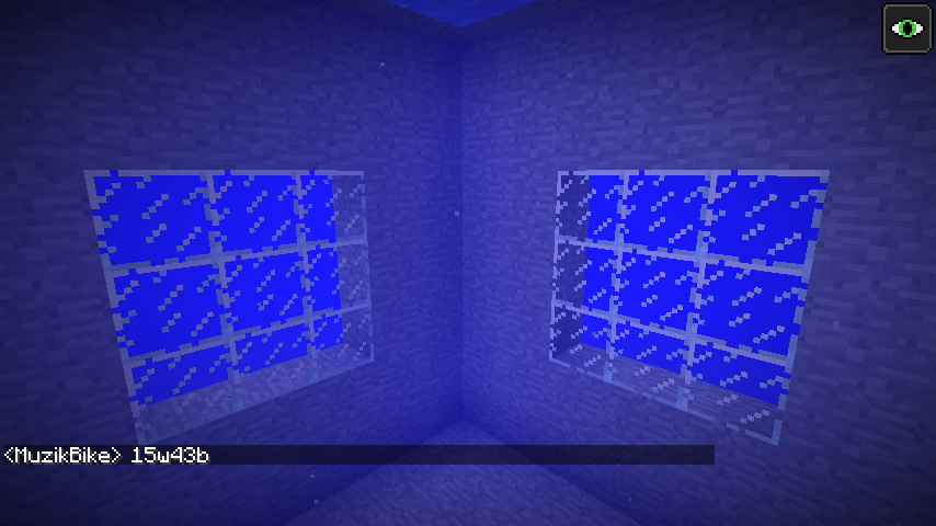 Snapshot 15w43b for 1.9 fixed MC-35790, an issue that made water hard to see through against glass due to it displaying the flowing texture. The fix made it display a flat, solid-colour texture instead. However, this also changed how glass looks from inside of the water - no texture is rendered against the glass at all. It'd be expected that the same flat water texture would be visible from inside the water, but this is not the case.