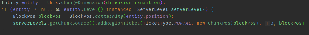 The following code introduced in 24w21b shows logic which sends the chunkloading ticket to the position an entity arrives in the other dimension. A world download is included with a test setup to verify the behaviour and its changes: