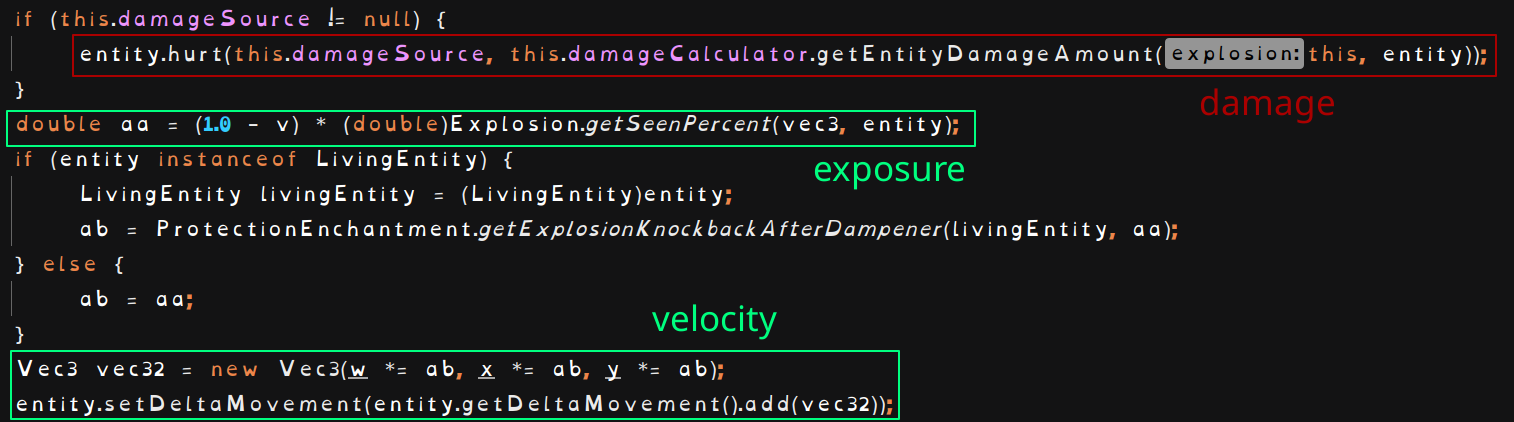 Despite this, as of 23w45a, the explosion's damage calculation was relocated to a different class, in a new method that takes only an Explosion object and an entity as parameters [3]. This means that to have the necessary values to compute the damage, the costly exposure computation and a handful of helper values need to be recomputed from scratch using the positions of the explosion and entity, even though all of them are already computed in the explode method for the applied velocity calculation [see 1b again]. As a result, each explosion now has about twice the amount of work when processing how it affects entities.