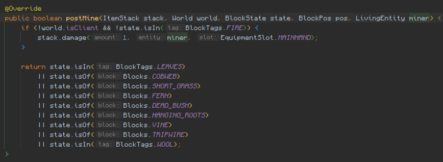 (Furthermore it shows that the minecraft:fire block tag is used to determine which blocks cause the shears to take durability damage, which also seems unintuitive and should probably be a separate tag that contains the fire tag, but that's probably a separate issue...)