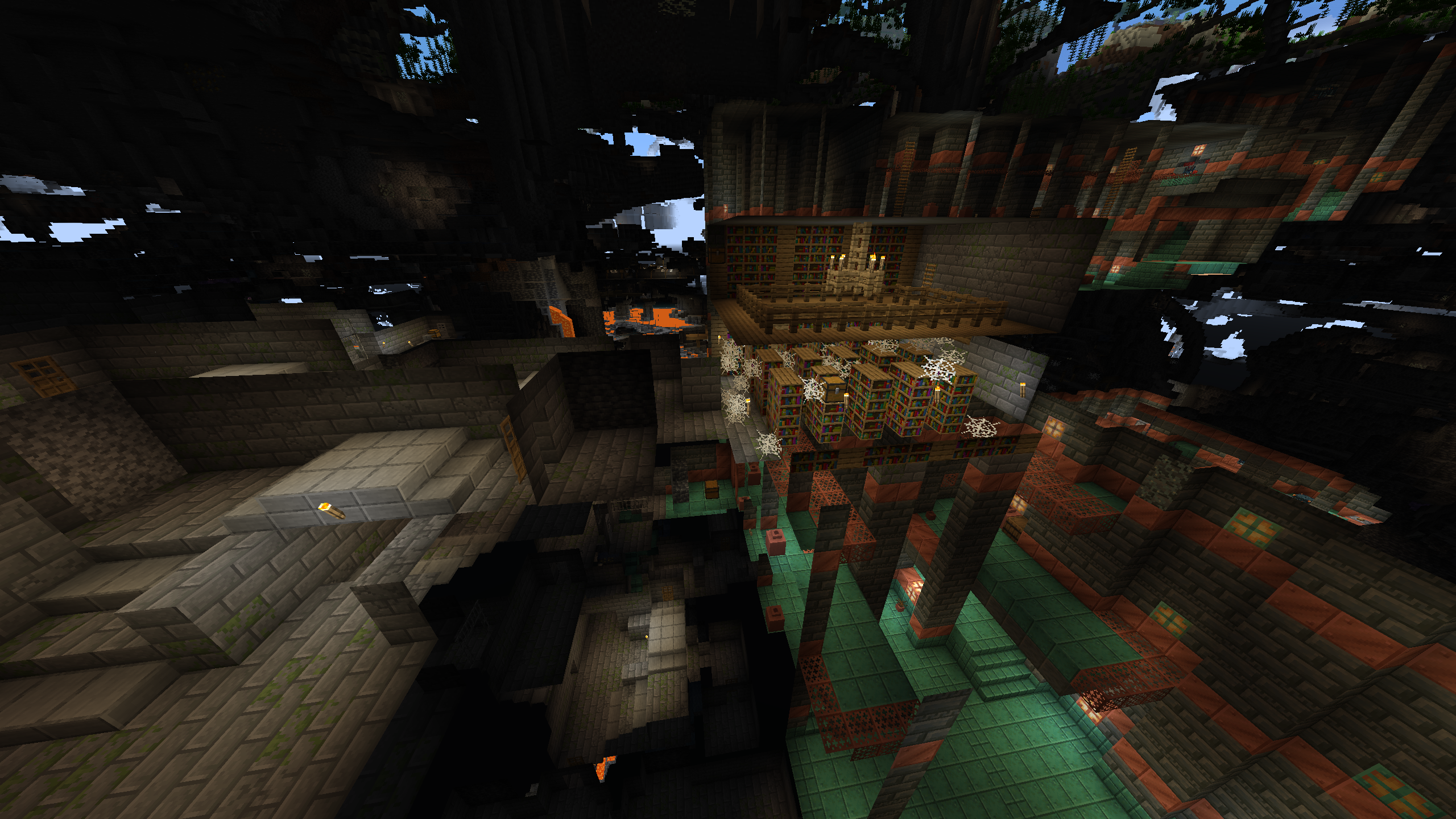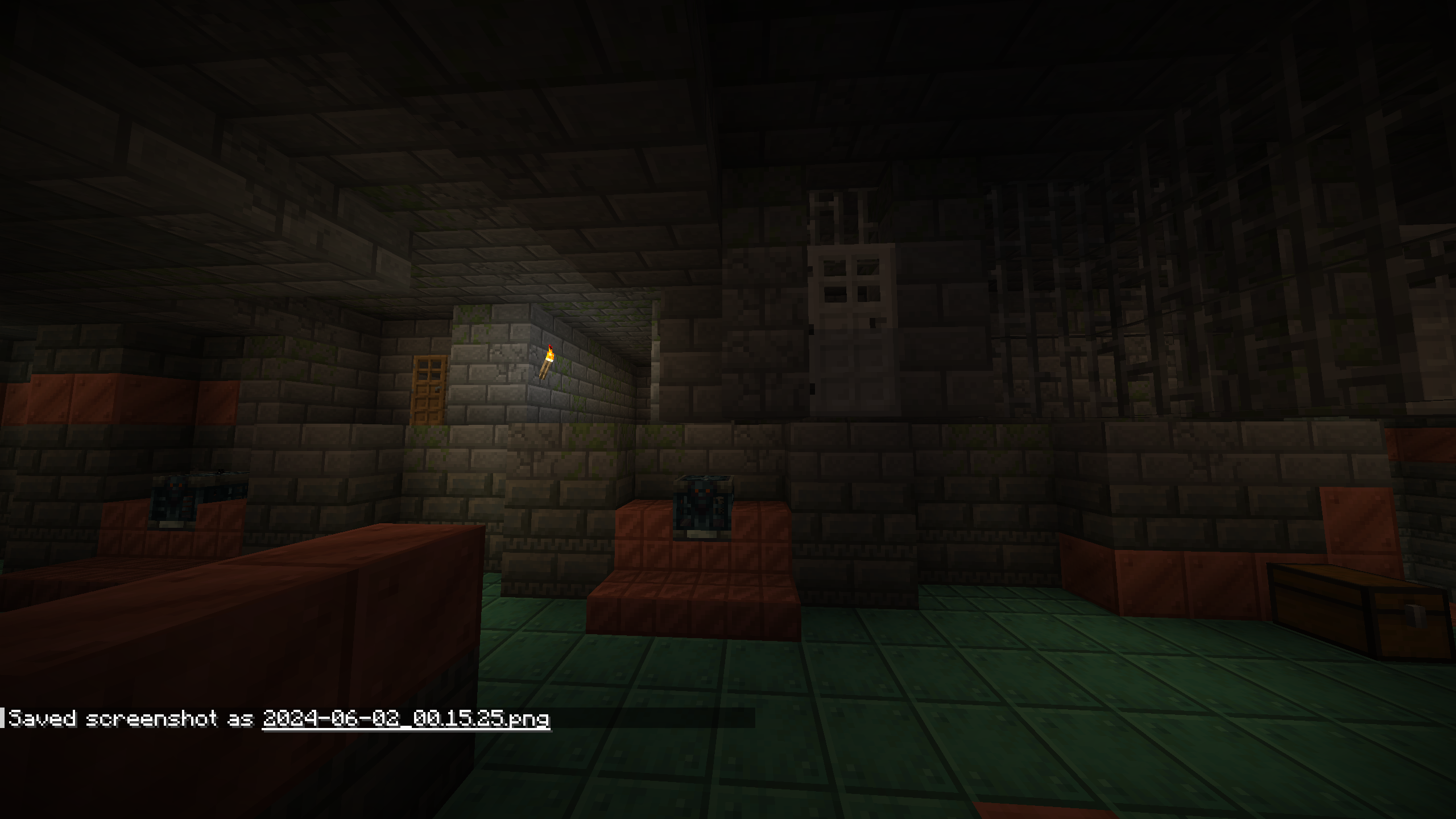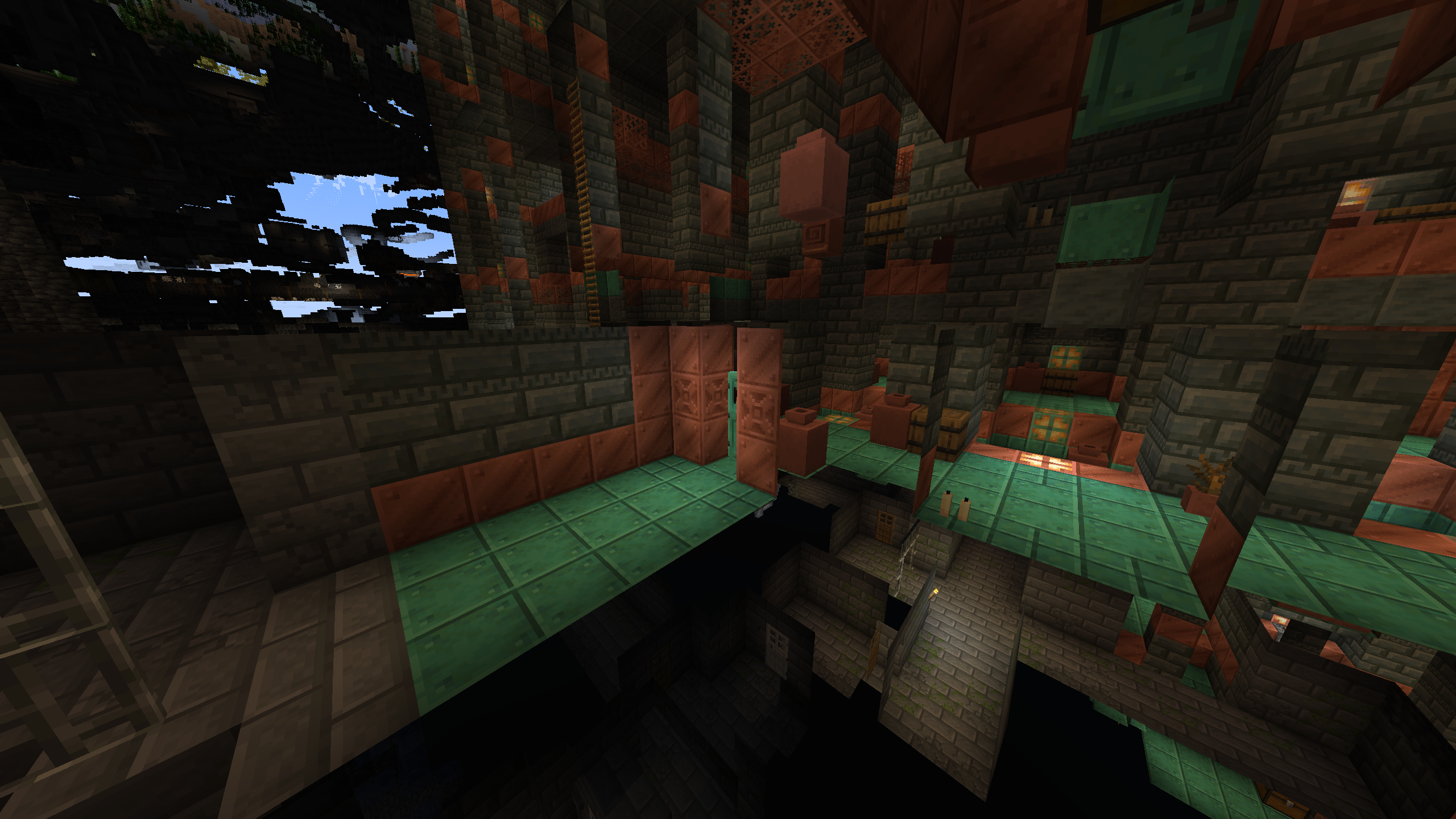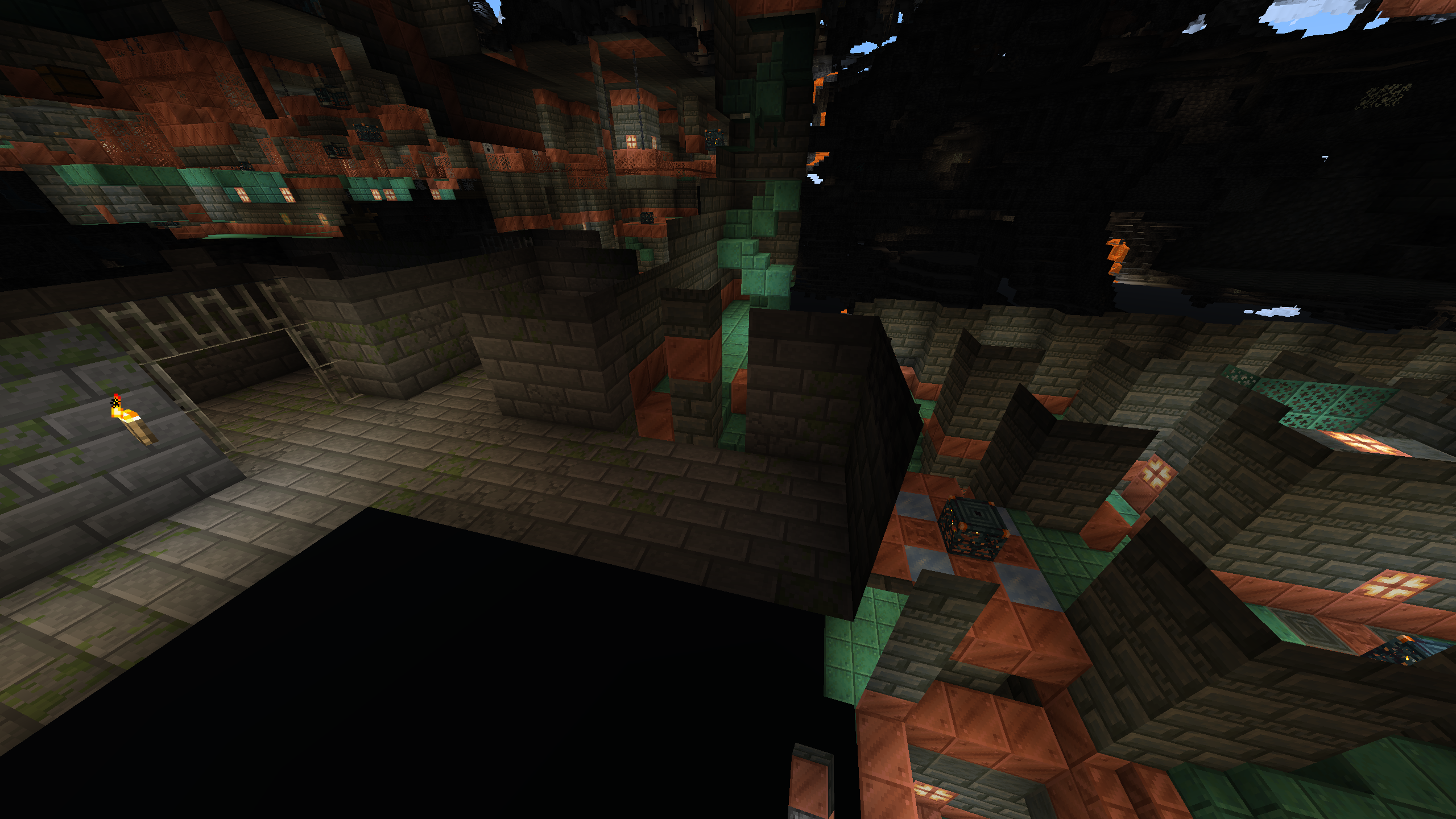 Stronghold intersects with Trail Chambers in odd ways, destroying parts of each. Seed is 4224753999504343670, Stronghold is at -391X, -7Y, 5213Z.