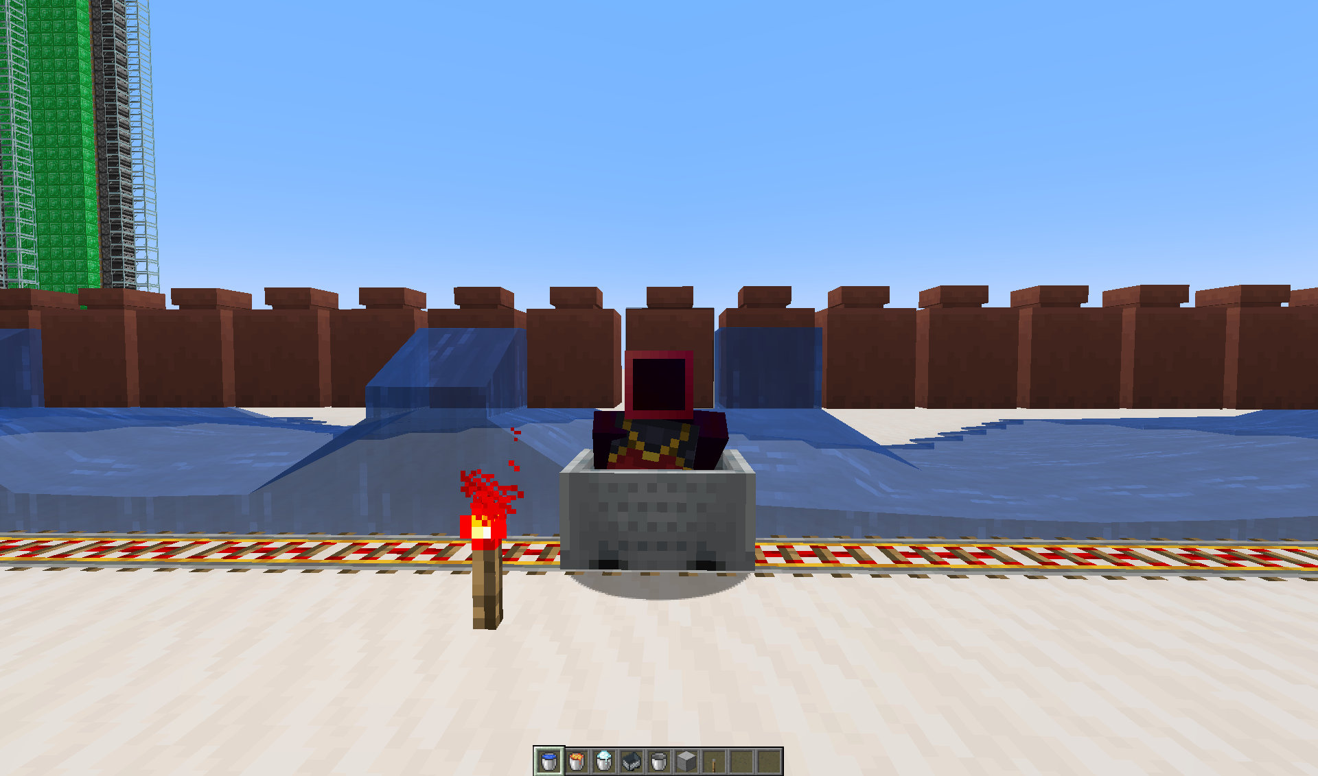 Open up a creative world and fill in a line of Decorated Pots 1 tile in the air, and a parallel line of Powered Rails on the ground nearby. Put any liquid bucket in your main hand, and attempt to use it on the decorated pots while riding a Minecart on the Powered Rail.