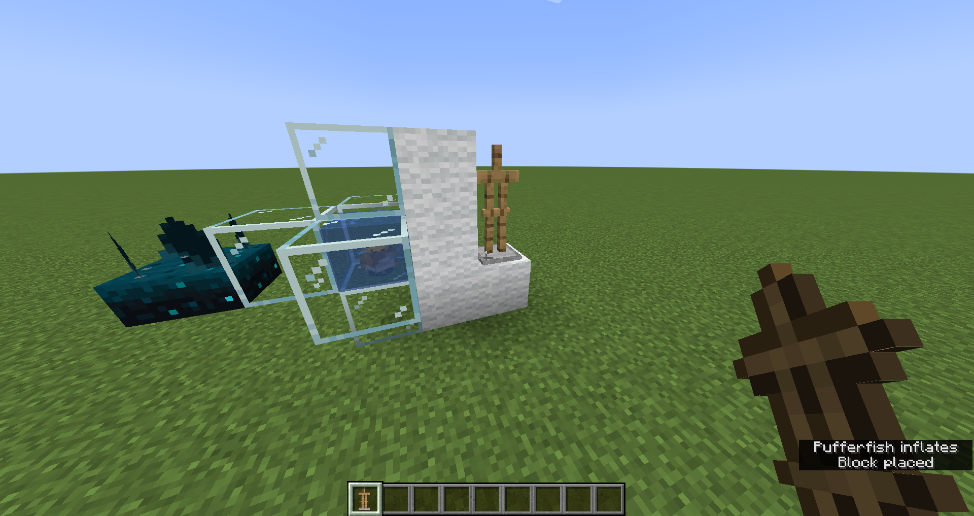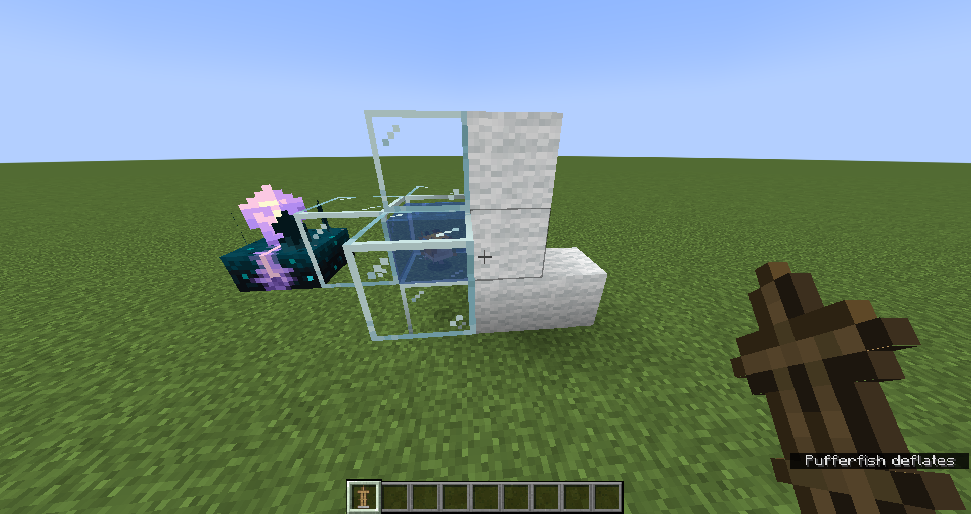 Place the entity on top of the sticking out wool block to cause the pufferfish to inflate, after the pufferfish is done inflating the entity can be removed to cause the pufferfish to deflate