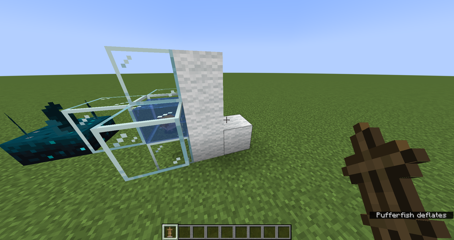 Recreate the setup as show in the first screenshot, with a water block with a pufferfish inside, surrounded by glass blocks on all sides except for the side that the entity will be placed which instead of a glass block will be a wool block