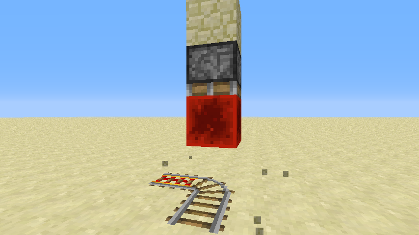 If you have a curved track (in screenshot below) following the exact schematics i showed you you will get the bug happening when the sticky piston pushes down the redstone block, then pushing down the rail but however this isn't supposed to happen. The sticky piston should not of pushed at all and the rail should not stay there. However this can be some great use for roller coasters and traps. If no redstone torch is under the curved rail, it will not work. If no 2 redstone torches are next to each other it will not work. Hopefully you will start looking at this and hopefully this will be removed. Thanks! 🙂