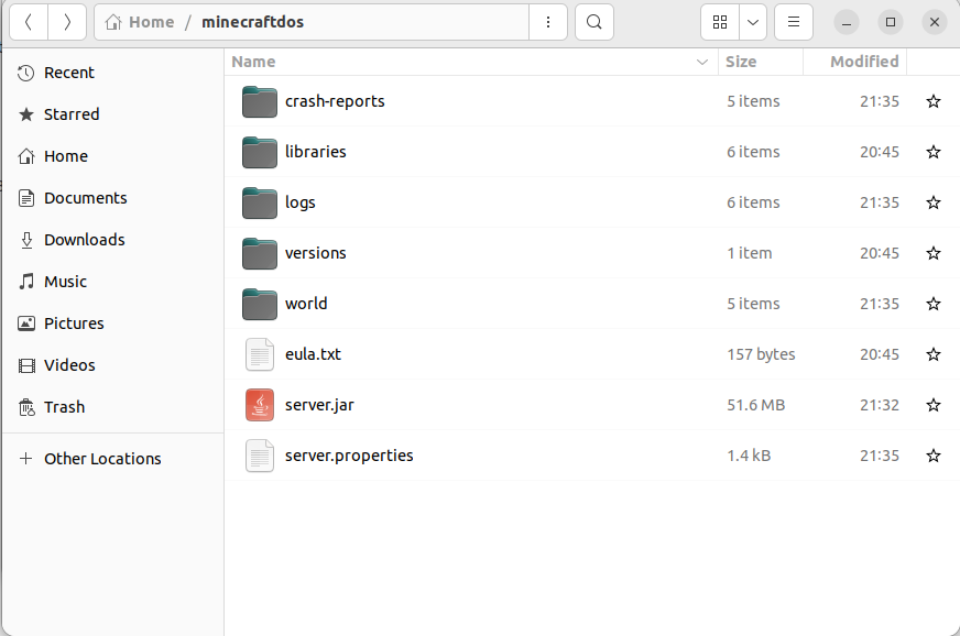 I have freshly installed the newest Java Edition server package for me to personally host on my Linux machine. I have 130GB of drive space open in the partition I'm hosting the server in (saying this because previous reddit posts indicate lack of drive space being the the cause of a similar issue.) I previously ran 1.20.4 and the more recent 1.20.6 (which broke all my datapacks D; ) in a different folder on the same drive with no issue. I made a new folder to run the 1.21 server in before I would port my world over to the new version. Before I could do that though, I've had the same error and crash upon initializing the server. This is after editing EULA.txt to true and trying to run the server for the first time upon agreeing. I'll attach an image of the folder to show what part of the initialization process it seems to be getting stuck on.