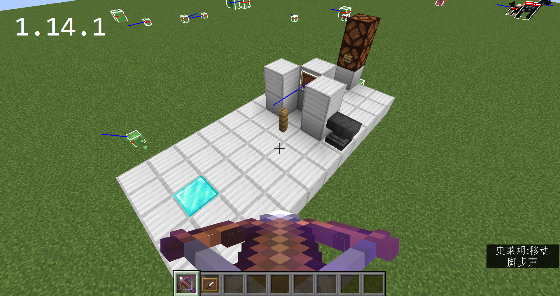 The First picture shows how i test this bug.Player stands on the diamond block and then shoot with the enchanted crossbow.The second to fifth picture respectively shows that the arrow piereces through the solid block and hit the button to light the redstone lamp.I also tested with the creeper, it also works.