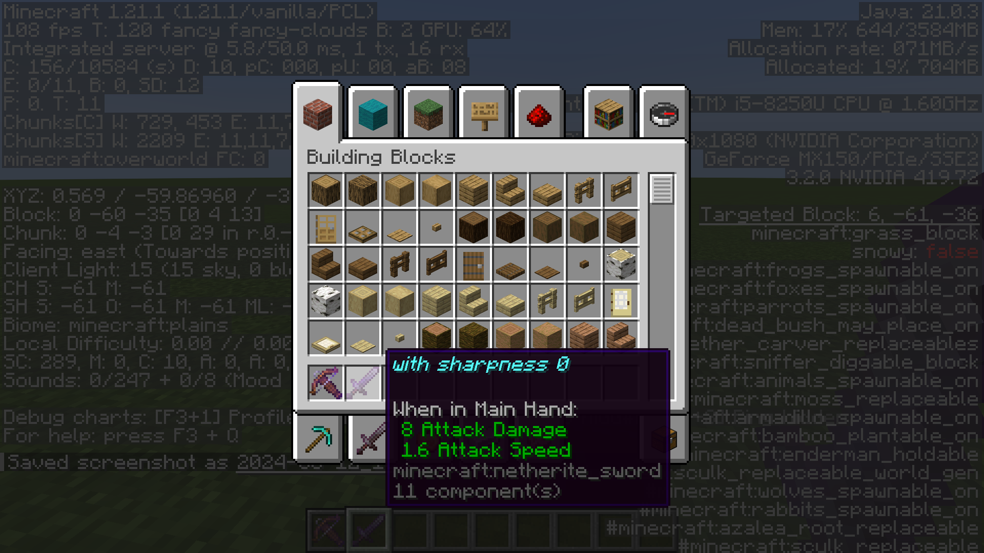 /give @s netherite_sword[enchantments={levels:{sharpness:0}}]2. Watch its tooltips in inventory.