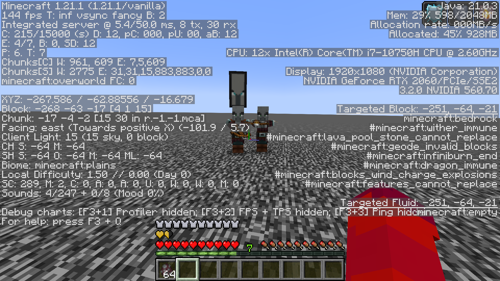 /summon pillager ~ ~ ~ {equipment:{mainhand:{id:"minecraft:crossbow",count:1,components:{"minecraft:enchantments":{"minecraft:test":1}}}}}3. Have the pillagers target you and reload at the same time.