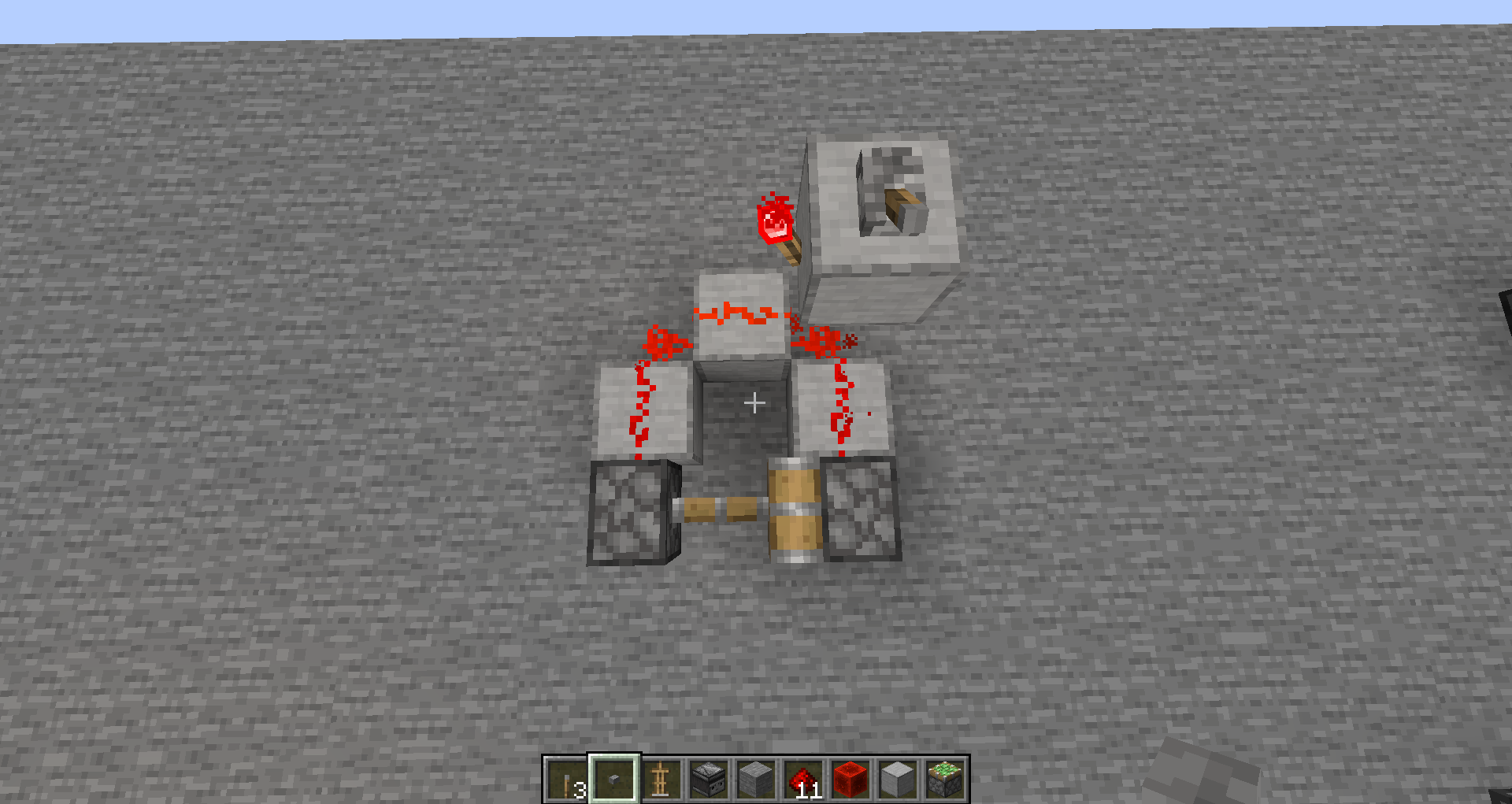 Also, the same bug applies not only to torches but also to buttons. In the given setup, you can replace the upper torch with either a button that hangs on that same wall (which makes the game ignore the button's rotation and randomize the outcome), or replace that same torch with a block and place a floor button on top of that block (which makes the wire accurately respond to the button's rotation)