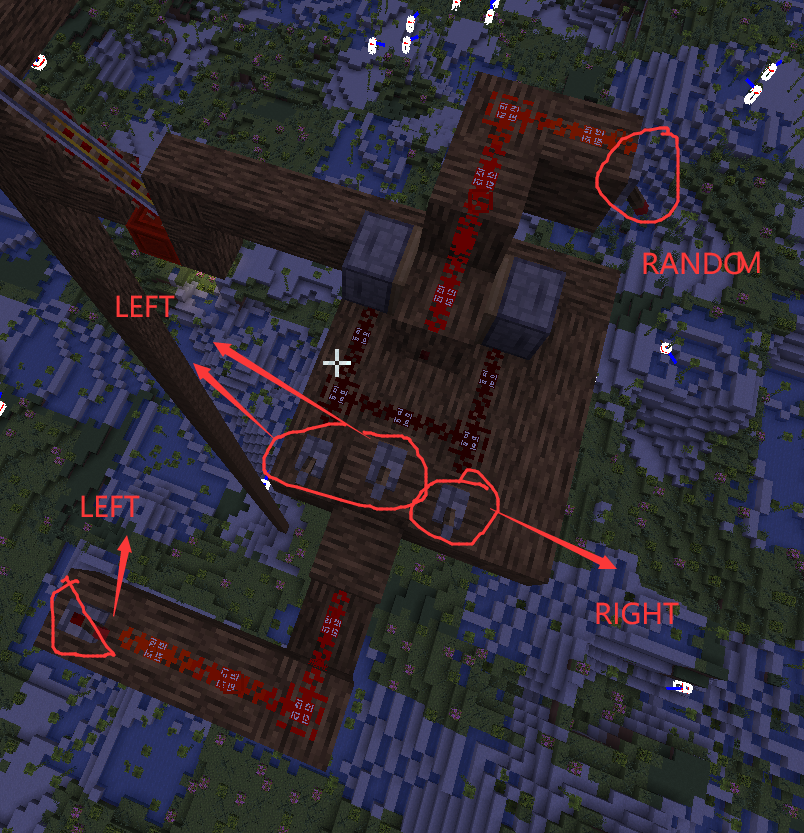 Since the upper torch points in the opposite direction, its local "left" should actually point into the piston that you labeled as "right". But even in that case, the behavior should still be deterministic, as opposed to the observed randomness.