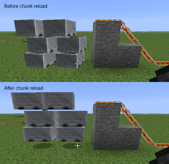 Minecarts detached from rails, before and after chunk reload, looks completely different in orientation and altitude.