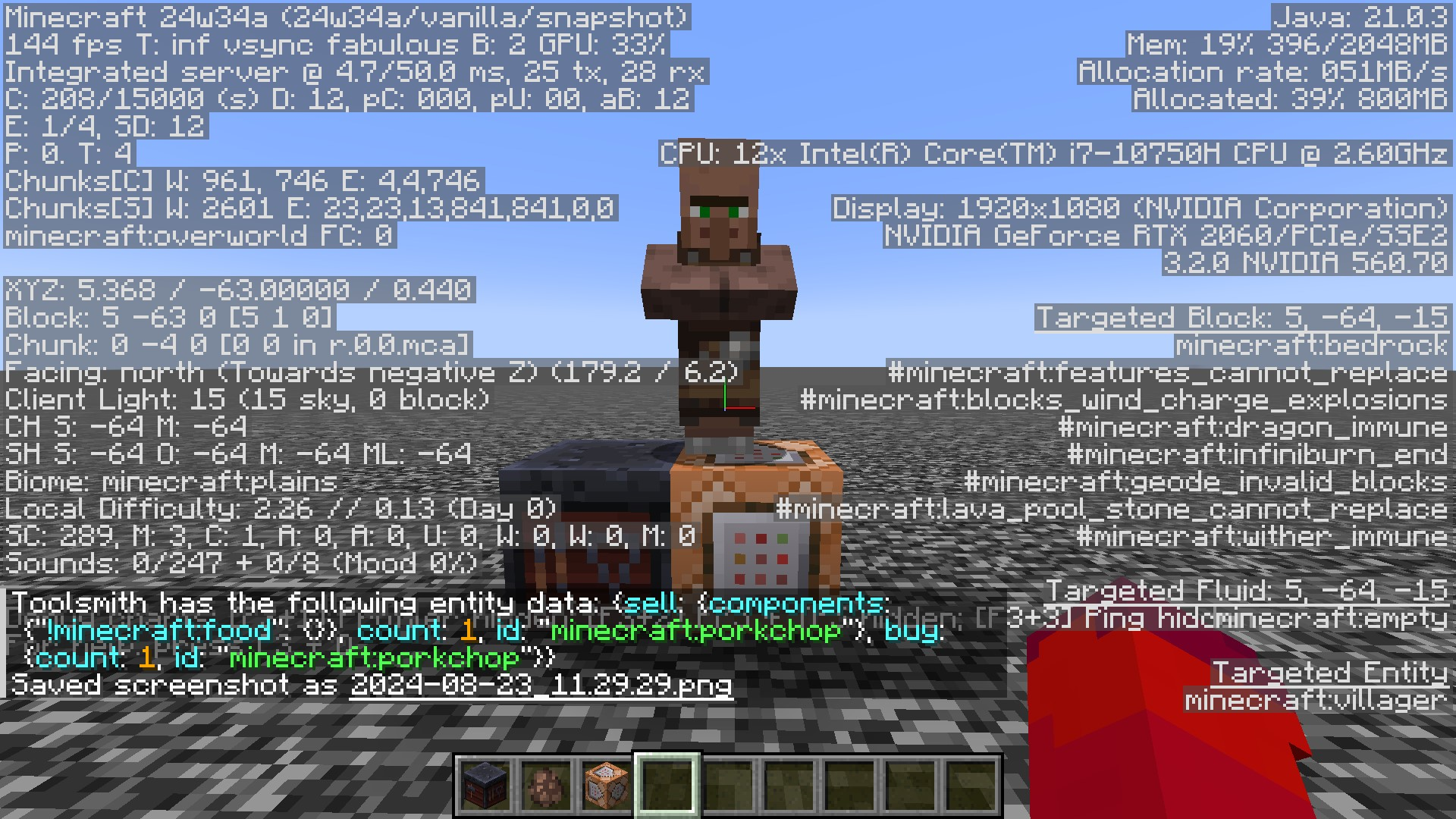 data modify entity @e[type=villager,sort=nearest,limit=1] Offers.Recipes append value {buy:{id:"minecraft:porkchop",components:{"!minecraft:food":{}}},buyB:{id:"minecraft:porkchop",components:{"!minecraft:food":{}}},sell:{id:"minecraft:porkchop",components:{"!minecraft:food":{}}}}The buyB slot is not present when the villager GUI is opened, and when running the following command, they show that the "!minecraft:food" component has been removed in the buy slot, but not in the sell slot