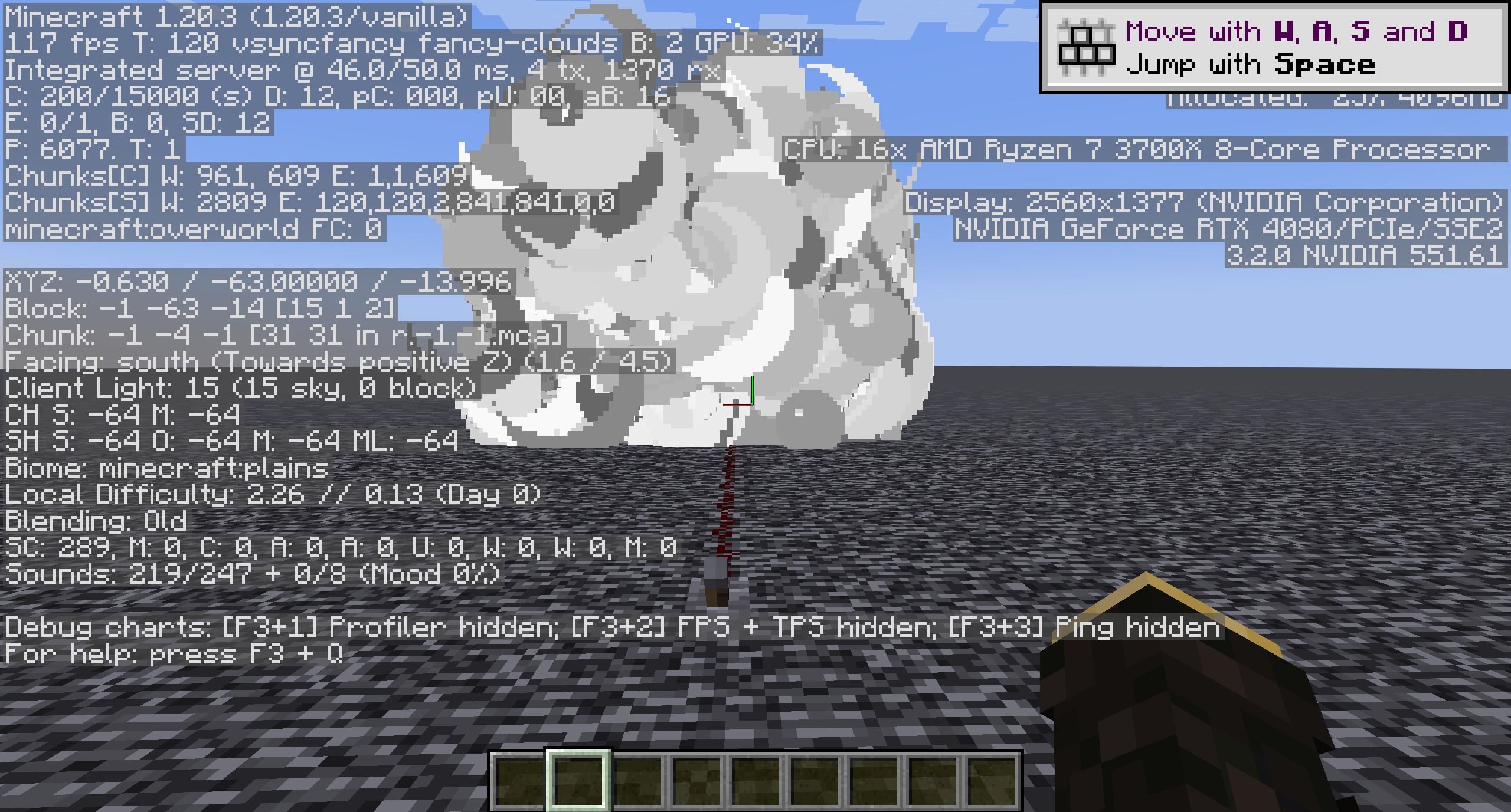 To verify that the issue lies within the block removal, one can use the same setup as shown in the screenshots above, but with a liquid source where the explosions happen, that way each explosion will collect no block positions for blocks to be exploded, thus skipping almost the entire block removal part of the explosion but not the other parts of the explosion, and indeed from my testing there is no lag difference in between 1.20.2 and 24w34a with water present.