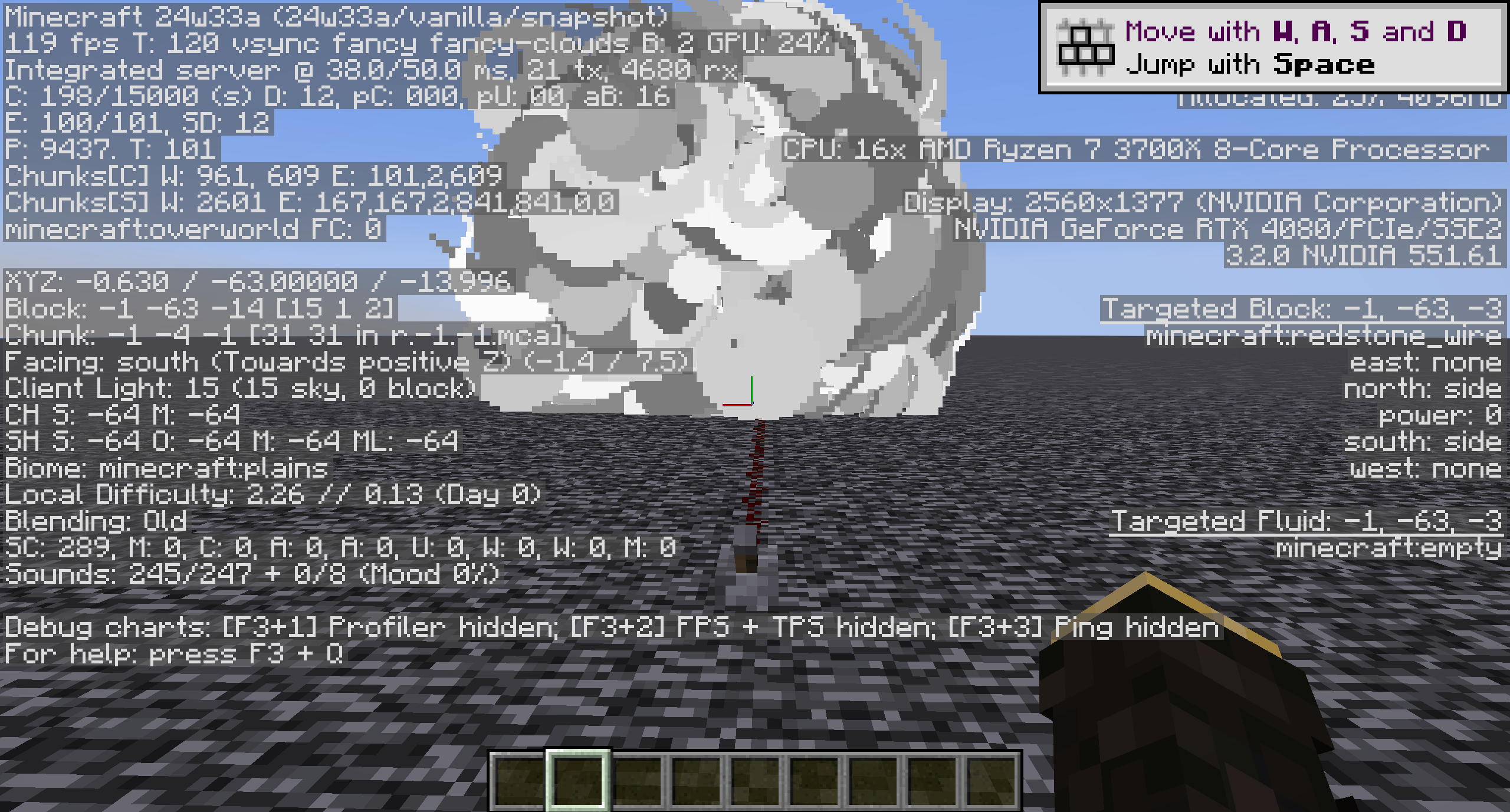 interactWithBlocksmethod inServerExplosion.java). Im not sure that there is only one lag causer within, but i can verify that the lag comes from somewhere there, as it is the only part of explosion code which changed significantly from 1.20.2 to 24w33a