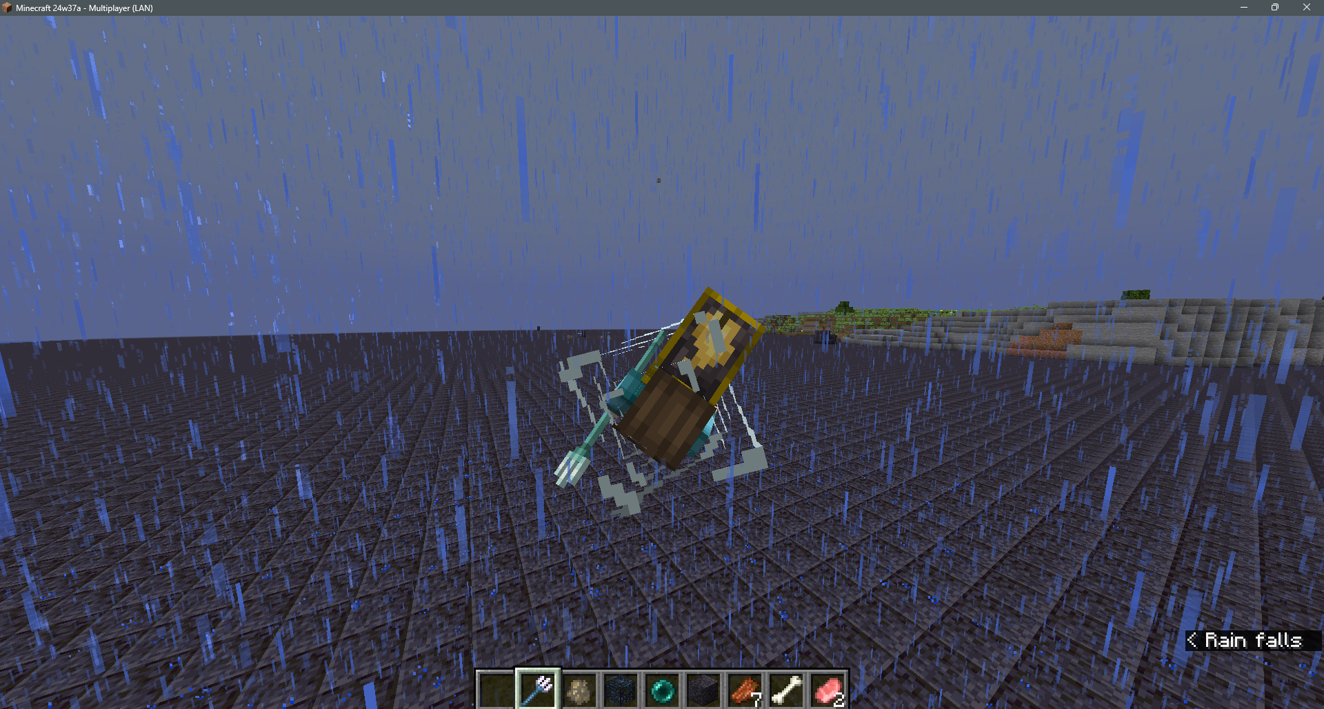 /give @s minecraft:trident[minecraft:enchantments={levels:{"minecraft:riptide":3}}]Set the weather to "rain" and begin using the trident to zoom forward.